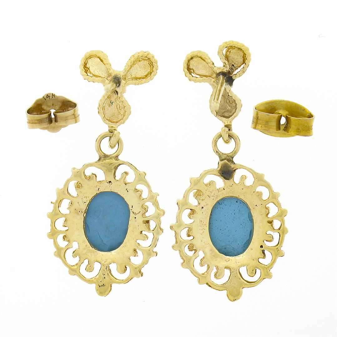 A solid 14k yellow gold dangle pair of earrings, with 2 round cabochon cut naural turquoises (2.1mm), and 2 oval cabochon cut natural turquoises (7.9x5.9mm). The earrings measure approximately 28.40x8.85mm and weigh a total of 3.89 grams.