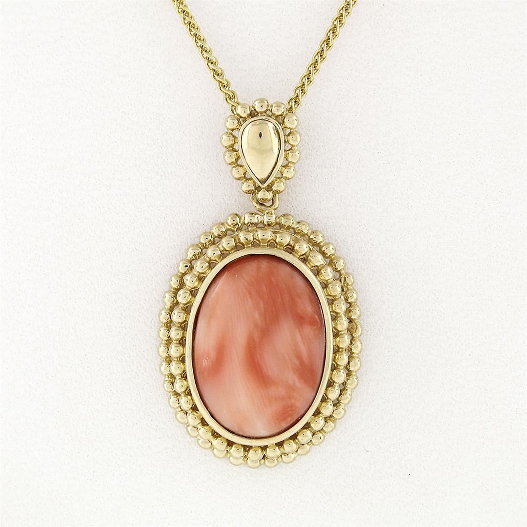 A vintage solid 14k yellow gold pendant necklace, with 1 ova, cabochon cut natural coral (14.3x10.3mm). The pendant weighs a total of 6.54 grams, measures 20.25x16.1mm including the bail, and 18 inch wheat link chain