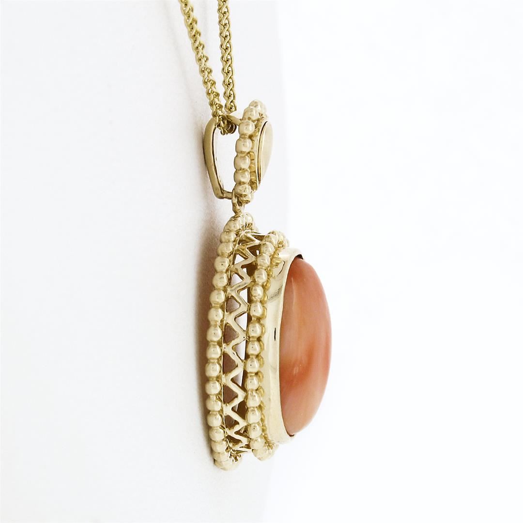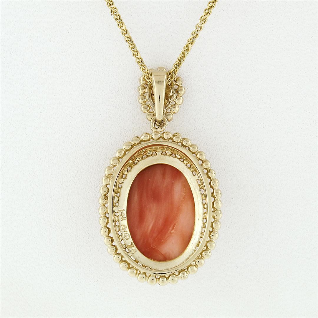 A vintage solid 14k yellow gold pendant necklace, with 1 ova, cabochon cut natural coral (14.3x10.3mm). The pendant weighs a total of 6.54 grams, measures 20.25x16.1mm including the bail, and 18 inch wheat link chain