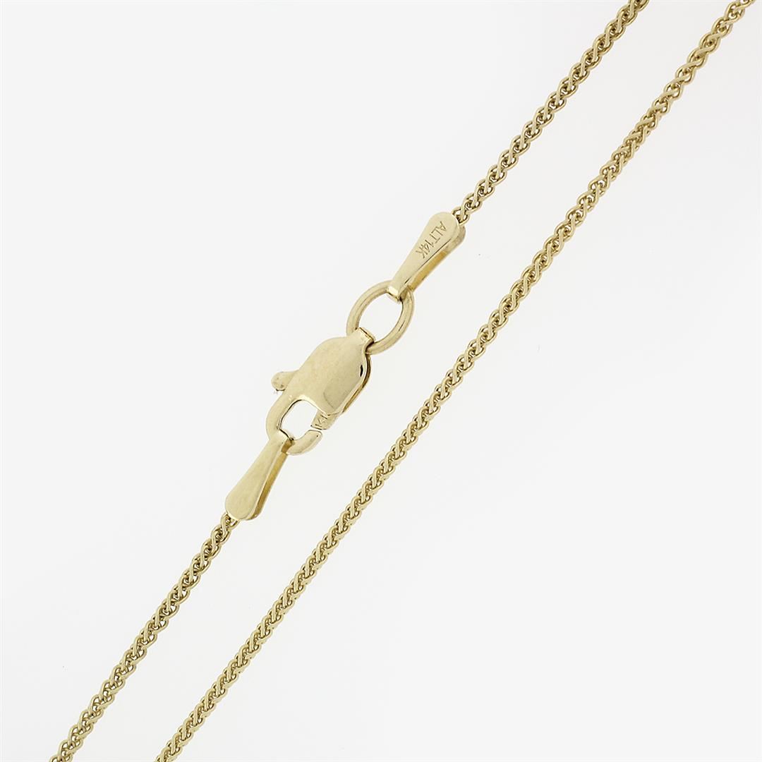 A vintage solid 14k yellow gold pendant necklace, with 1 ova, cabochon cut natural coral (14.3x10.3mm). The pendant weighs a total of 6.54 grams, measures 20.25x16.1mm including the bail, and 18 inch wheat link chain