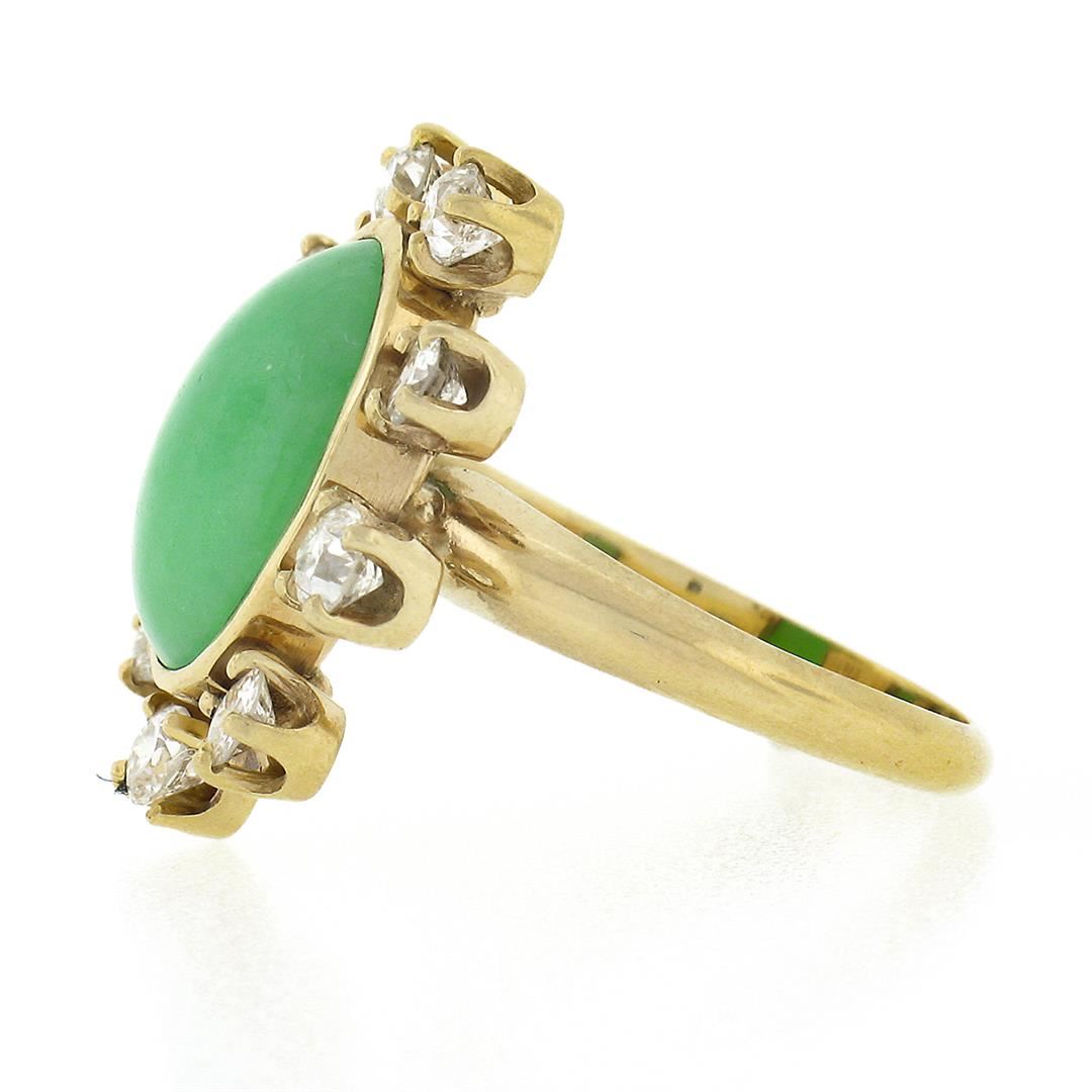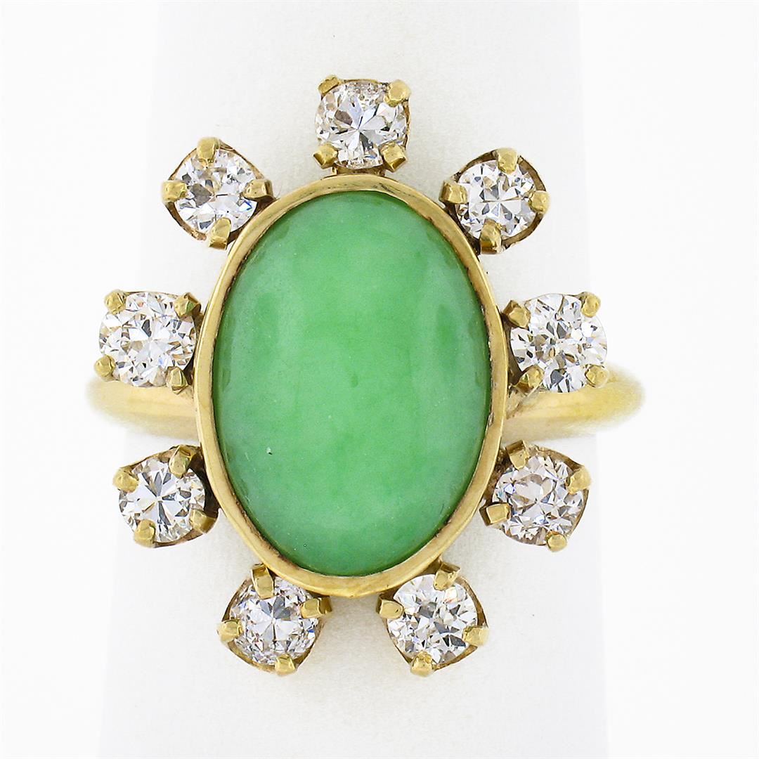 A vintage solid 14k yellow gold ring, with 1 oval cabochon cut natural jade (12.7x9.1mm), and 9 old European cut natural diamonds (H/I - VS2/SI1 ; 1.10ctw ). The ring is size 6.0, weighs a total of 5.26 grams, and measures 20.30mm wide.