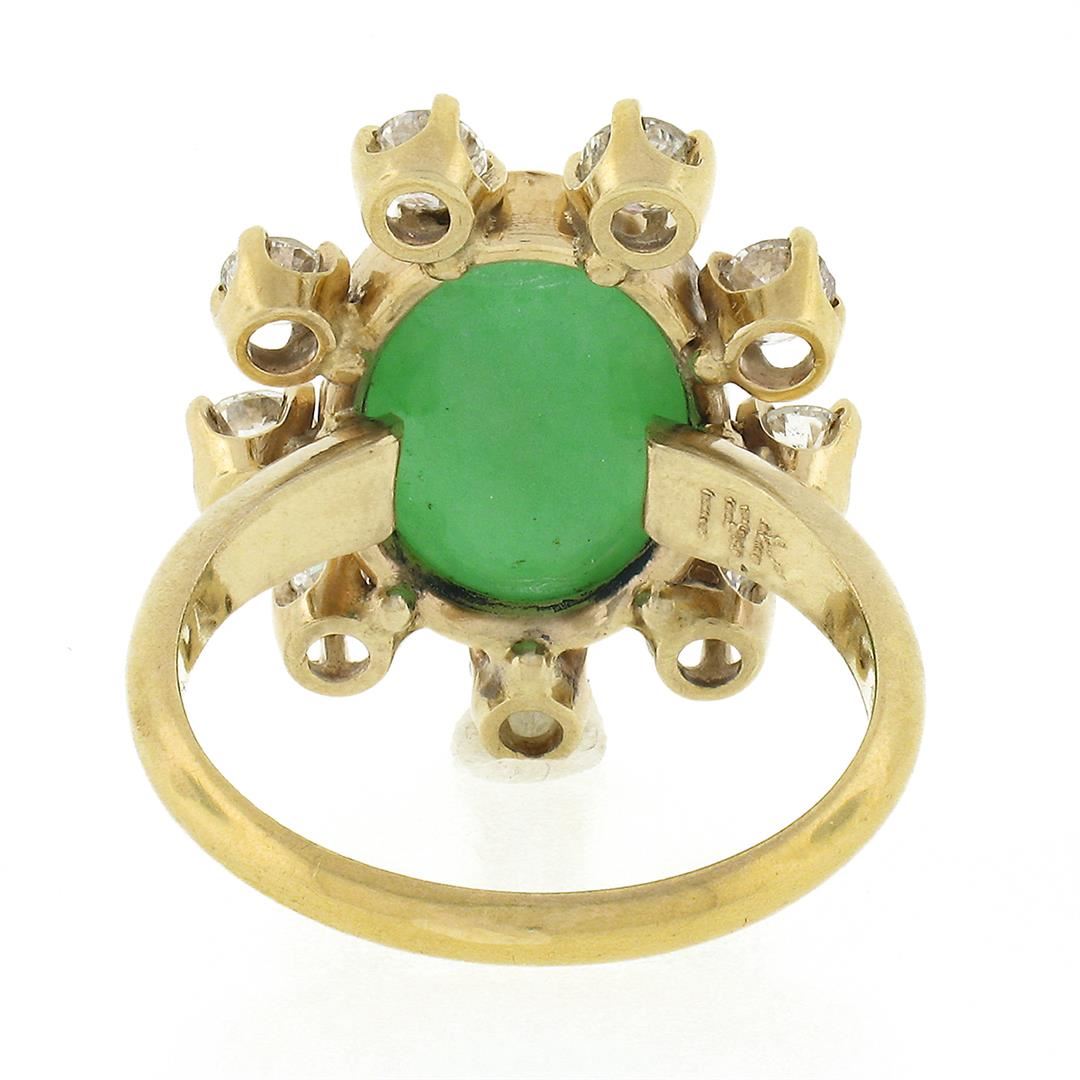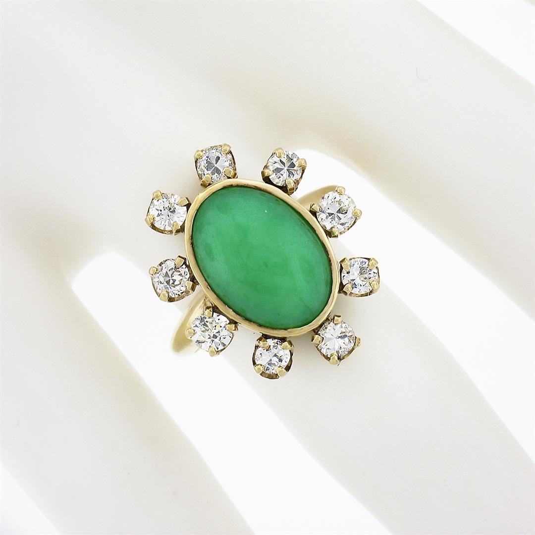 A vintage solid 14k yellow gold ring, with 1 oval cabochon cut natural jade (12.7x9.1mm), and 9 old European cut natural diamonds (H/I - VS2/SI1 ; 1.10ctw ). The ring is size 6.0, weighs a total of 5.26 grams, and measures 20.30mm wide.