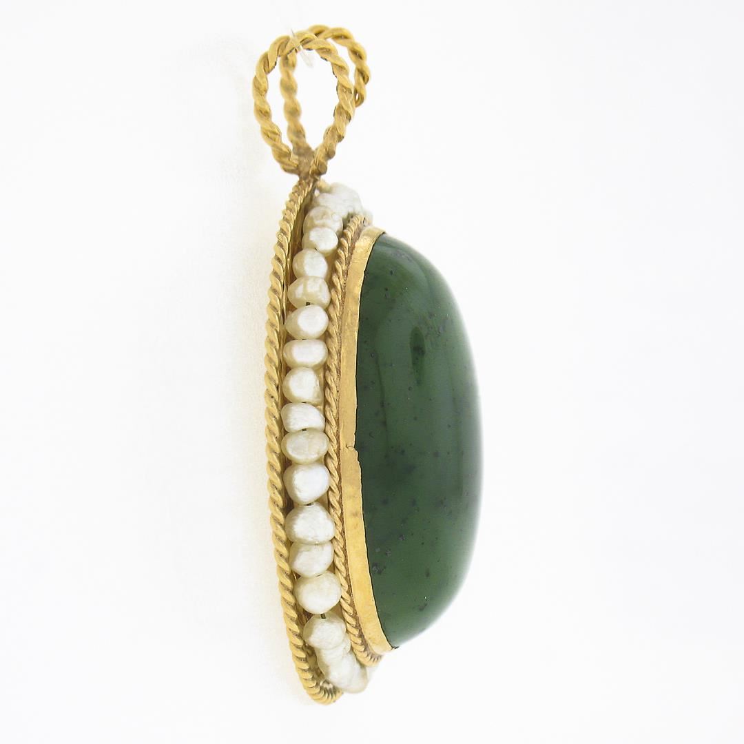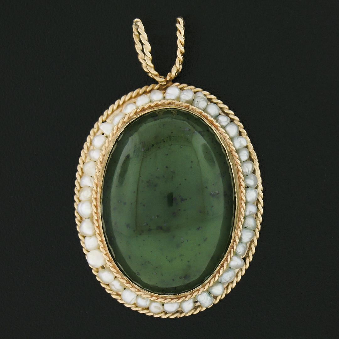 A vintage solid 14k yellow gold pendant, with 1 oval cabochon cut natural jade (21.2x15.2mm), and a halo of numerous of semi round shape seed pearls (1mm to 2mm each ). The pendant weighs a total of 6.82 grams, measures ##x##mm including the bail, and the inside of the bail measures ##x##mm.