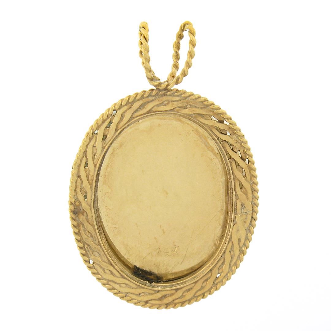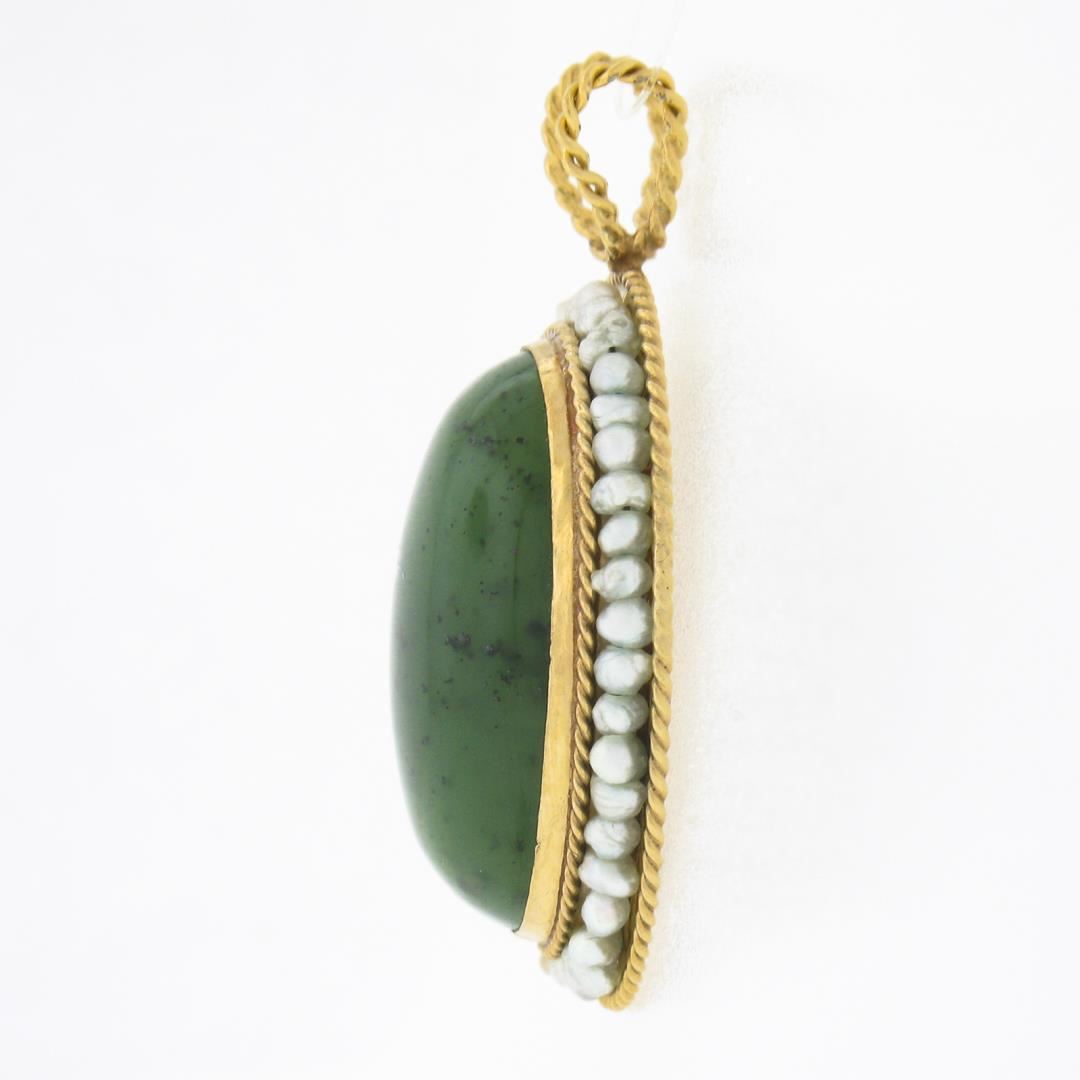 A vintage solid 14k yellow gold pendant, with 1 oval cabochon cut natural jade (21.2x15.2mm), and a halo of numerous of semi round shape seed pearls (1mm to 2mm each ). The pendant weighs a total of 6.82 grams, measures ##x##mm including the bail, and the inside of the bail measures ##x##mm.