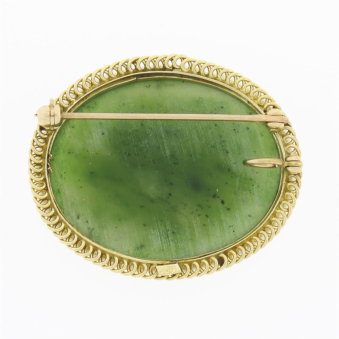 A vintage solid 14k yellow gold brooch pendant, with 1 oval cabochon cut natural jade (29.80x23.50mm), surrounded with a halo of seed pearls (0.7mm each). Measures 39.65x29mm and weighs a total of 9.32 grams.