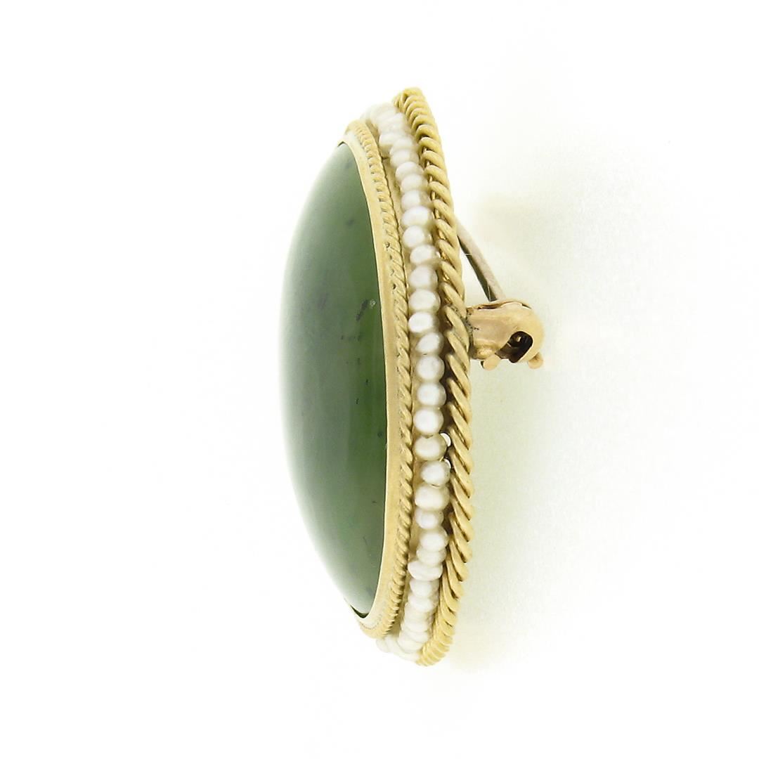 A vintage solid 14k yellow gold brooch pendant, with 1 oval cabochon cut natural jade (29.80x23.50mm), surrounded with a halo of seed pearls (0.7mm each). Measures 39.65x29mm and weighs a total of 9.32 grams.