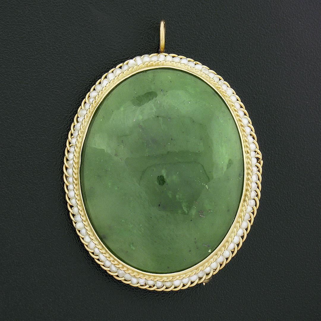 A vintage solid 14k yellow gold brooch pendant, with 1 oval cabochon cut natural jade (29.80x23.50mm), surrounded with a halo of seed pearls (0.7mm each). Measures 39.65x29mm and weighs a total of 9.32 grams.