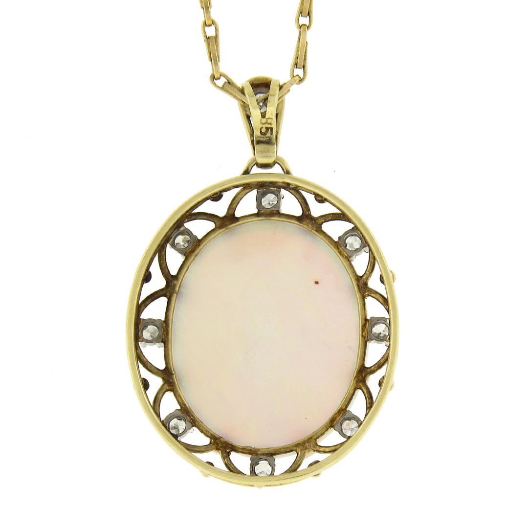 A vintage solid 14k yellow gold pendant necklace, with 1 oval cabochon cut natural opal (22.1x18.5mm), and 9 single cut natrual diamonds (G/H - VS2-SI2 ; 0.28ct ). 15.5 inch fancy link chain, 10.44 grams total weight, pendant measures 37.3x24.6mm.