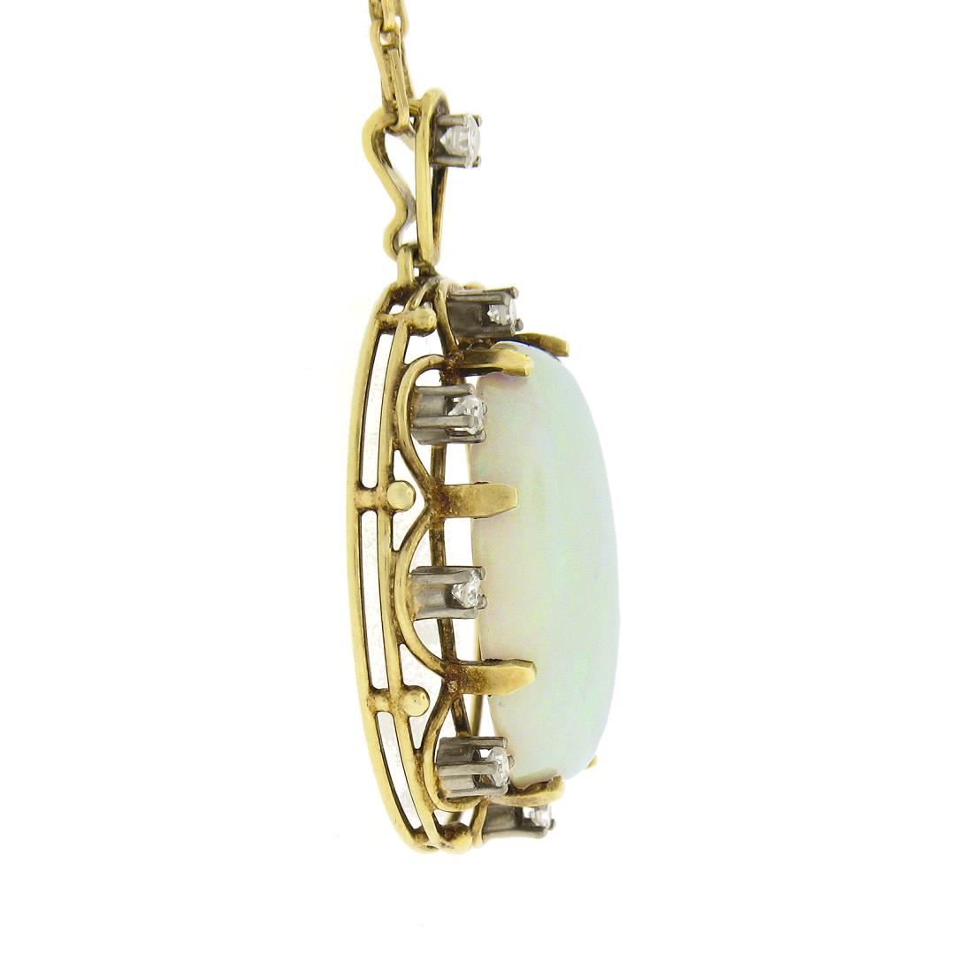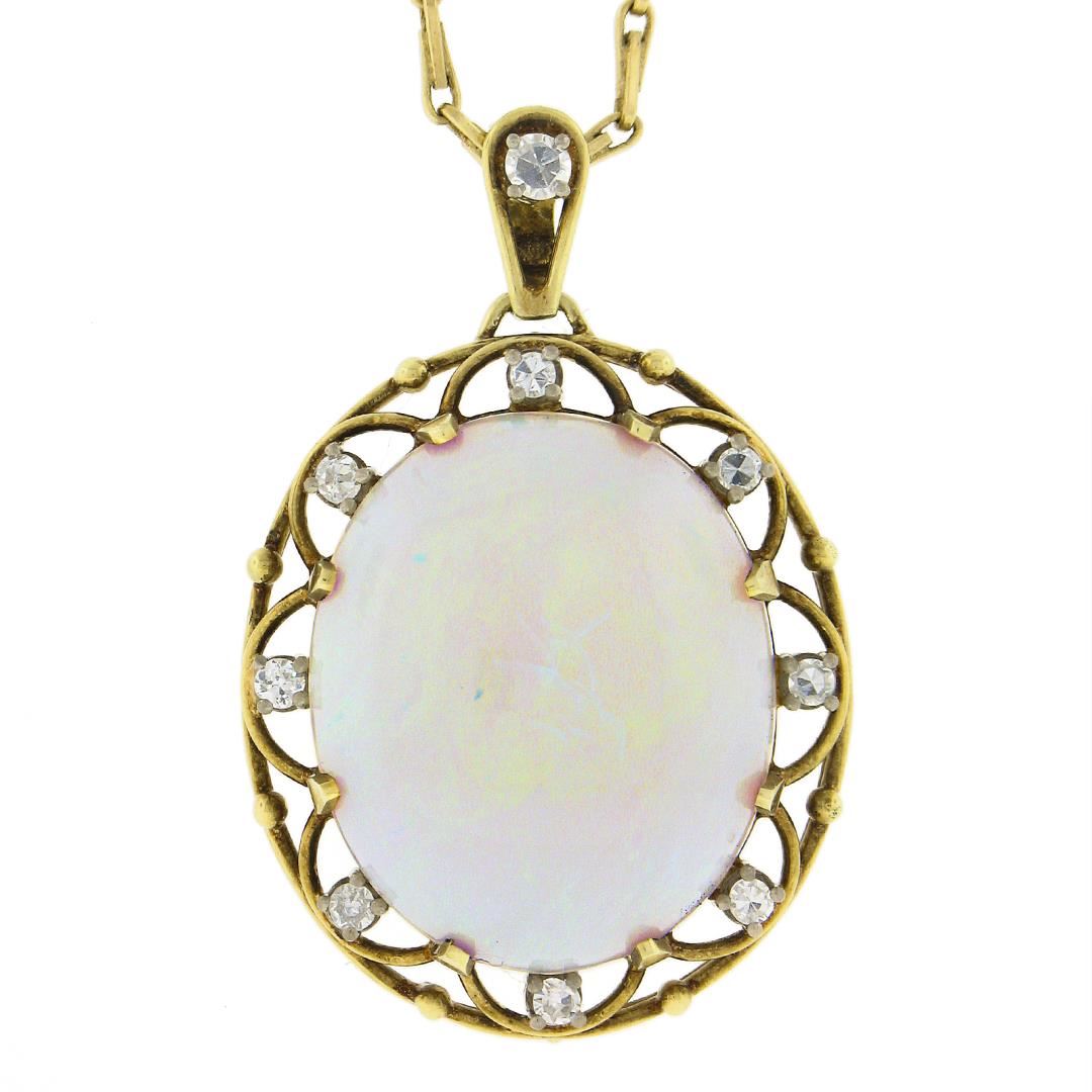 A vintage solid 14k yellow gold pendant necklace, with 1 oval cabochon cut natural opal (22.1x18.5mm), and 9 single cut natrual diamonds (G/H - VS2-SI2 ; 0.28ct ). 15.5 inch fancy link chain, 10.44 grams total weight, pendant measures 37.3x24.6mm.