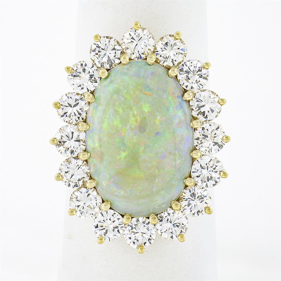 A solid 14k yellow gold ring, with 1 oval cabochon cut natural opal (18x12.45mm), surrounded with a halo of 16 round brilliant cut natural diamonds (G/H - VS1-SI1 ; 4.0ctw). The ring is size 7.0, weighs a total of 8.72 grams, and measures 26.70mm wide.