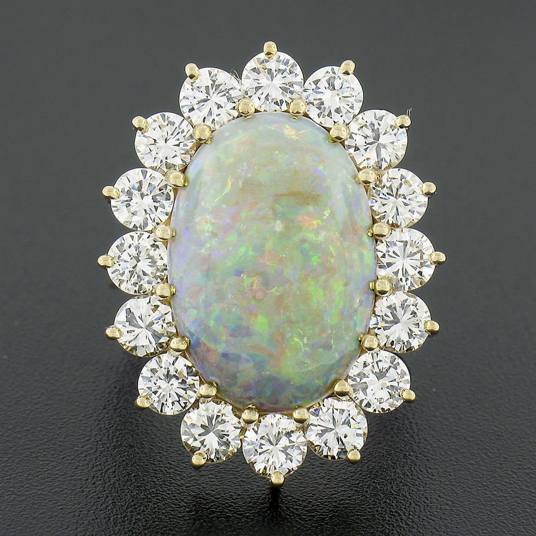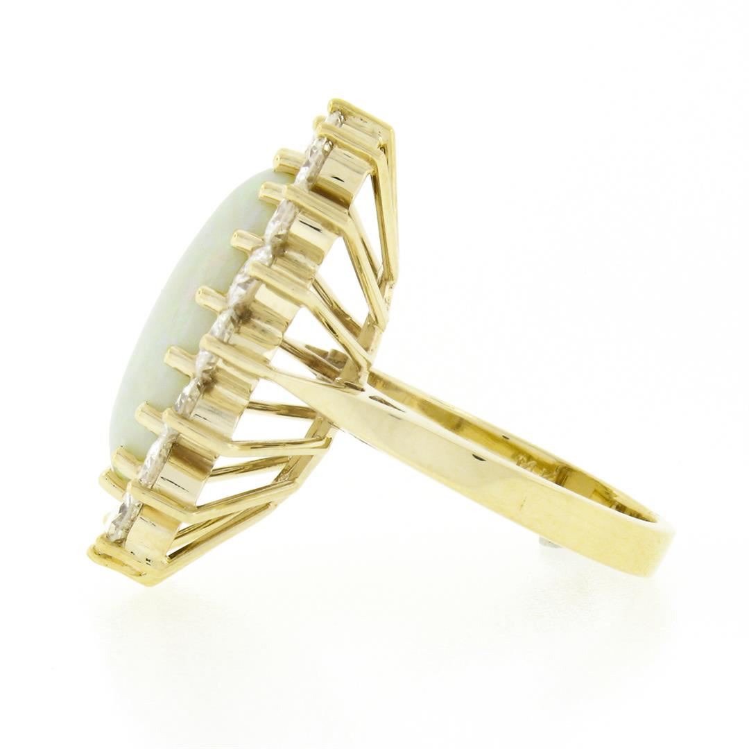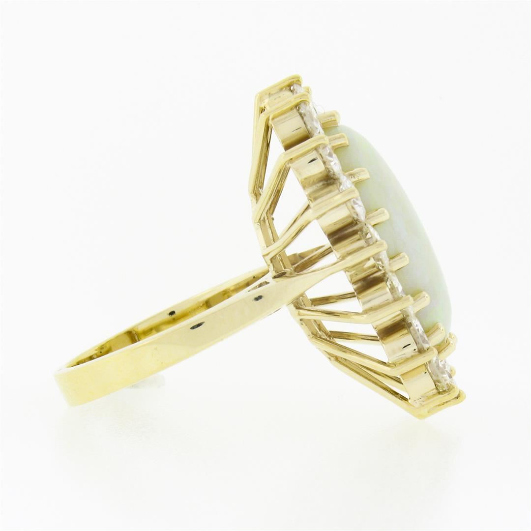 A solid 14k yellow gold ring, with 1 oval cabochon cut natural opal (18x12.45mm), surrounded with a halo of 16 round brilliant cut natural diamonds (G/H - VS1-SI1 ; 4.0ctw). The ring is size 7.0, weighs a total of 8.72 grams, and measures 26.70mm wide.