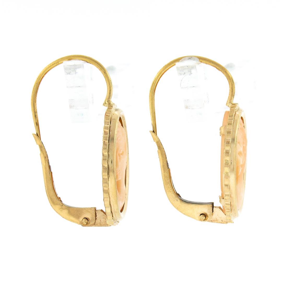 A vintage solid 14k yellow gold dangle earrings, with 2 oval shape carved cameo shell. The earrings measure approximately 25x15.20mm and weigh a total of 4.49 grams.
