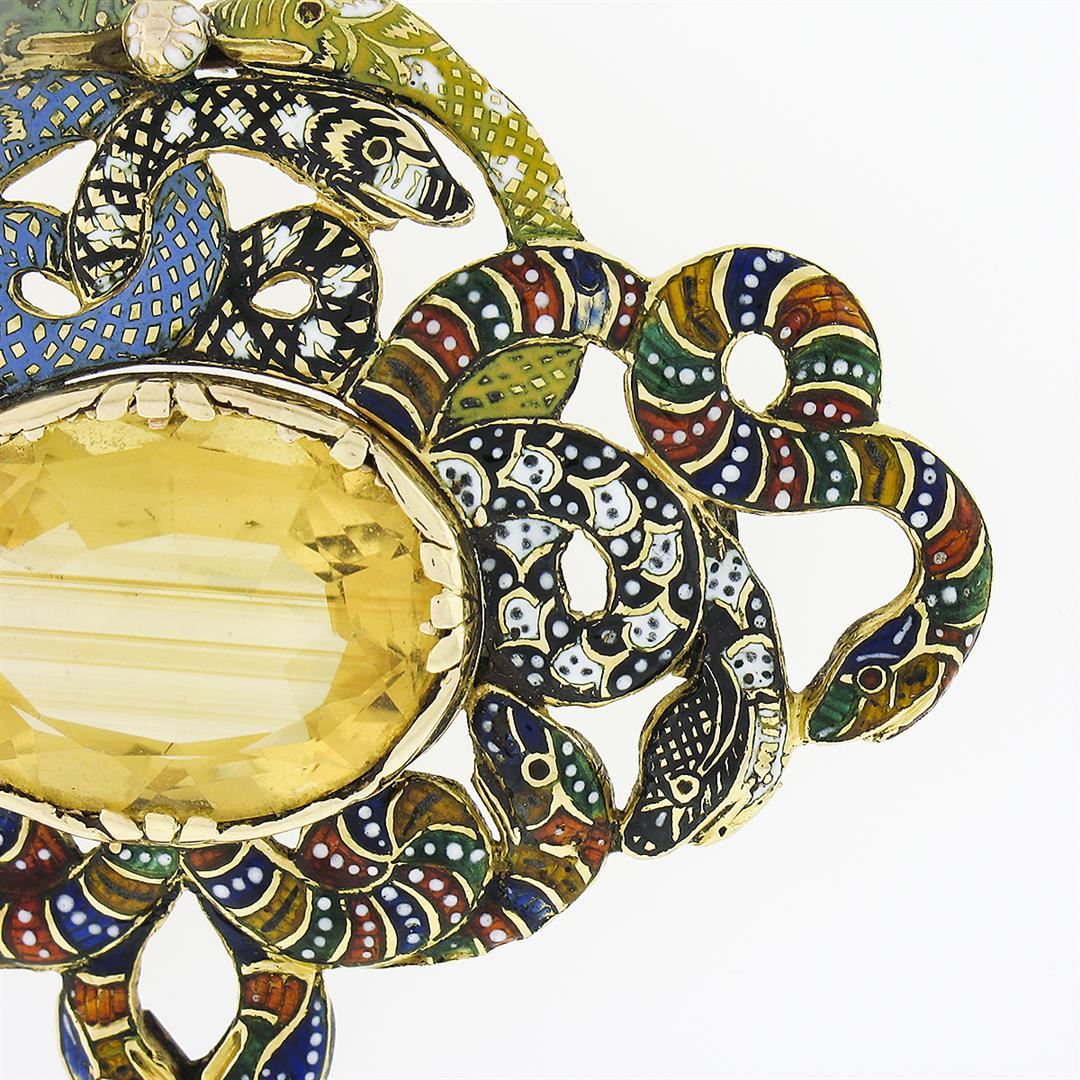 A solid 14k yellow gold Serpent snake brooch pendant, with multi colors enamel work, and 1 oval step cut natural citrine (15x12mm - 6.5ct ). Measures 34.3x44.65mm and weighs a total of 11.45 grams.