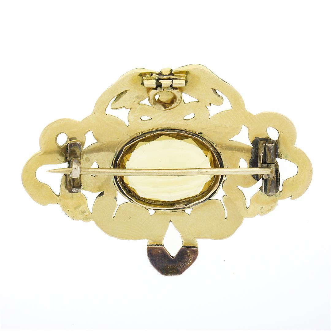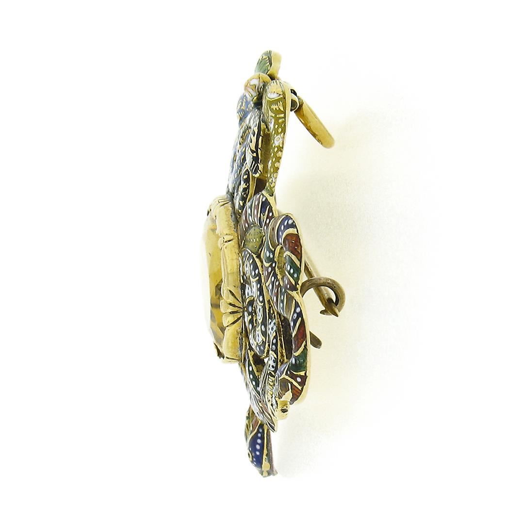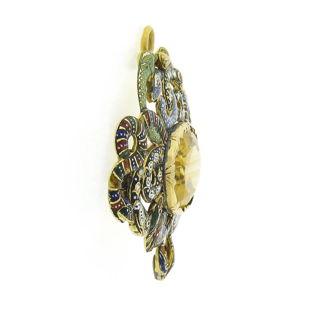 A solid 14k yellow gold Serpent snake brooch pendant, with multi colors enamel work, and 1 oval step cut natural citrine (15x12mm - 6.5ct ). Measures 34.3x44.65mm and weighs a total of 11.45 grams.