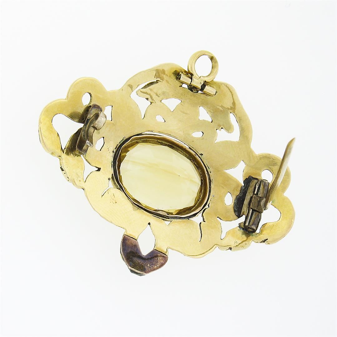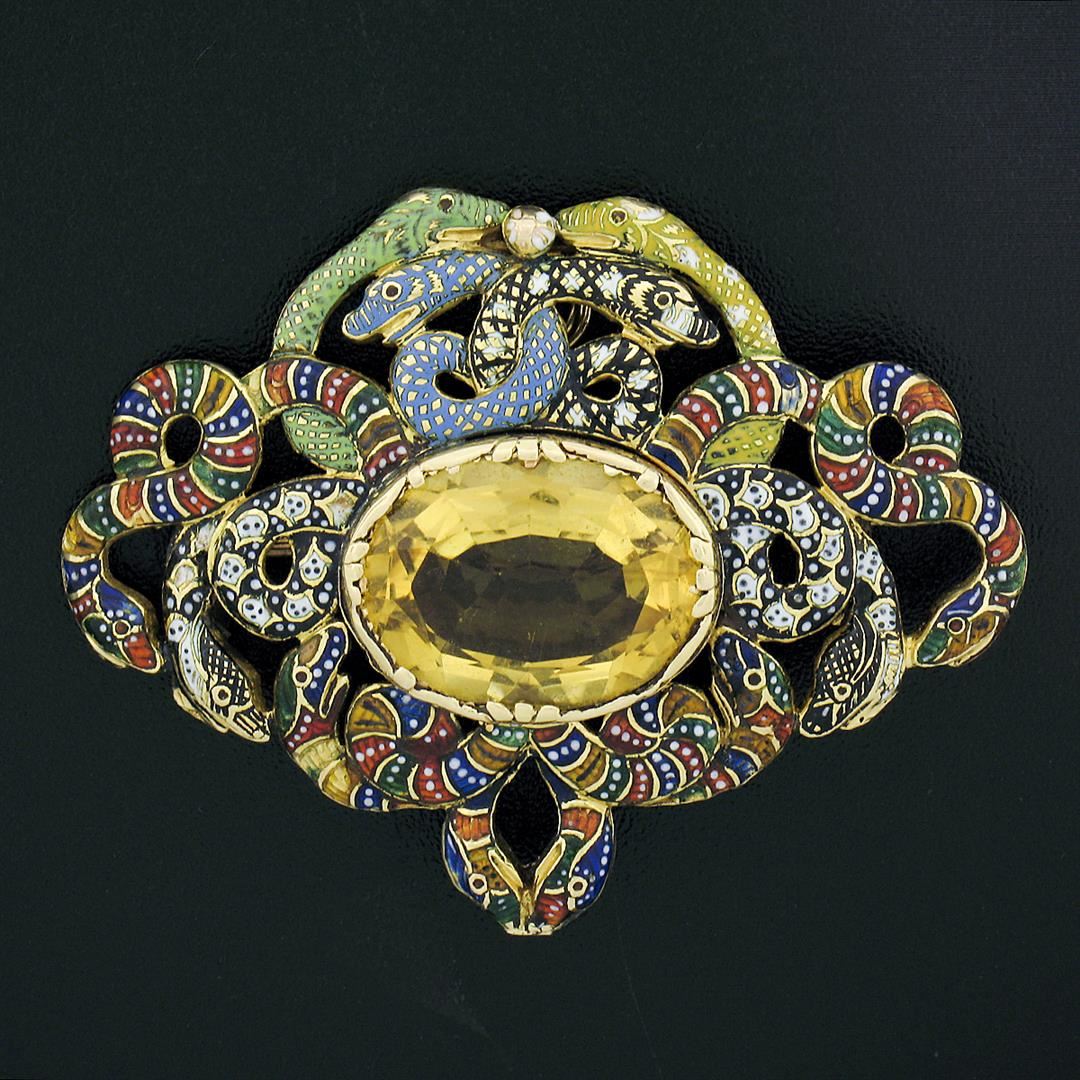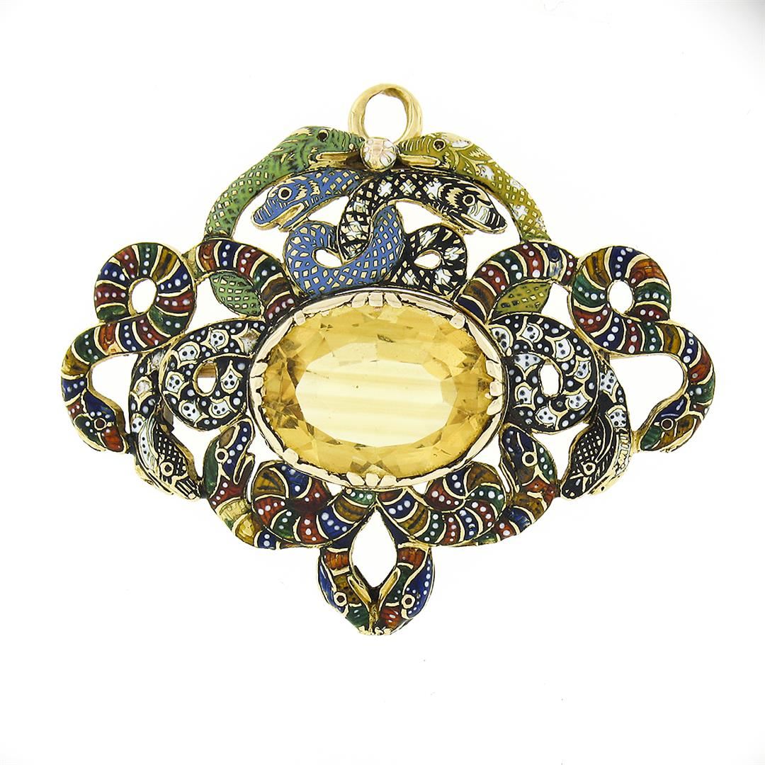 A solid 14k yellow gold Serpent snake brooch pendant, with multi colors enamel work, and 1 oval step cut natural citrine (15x12mm - 6.5ct ). Measures 34.3x44.65mm and weighs a total of 11.45 grams.