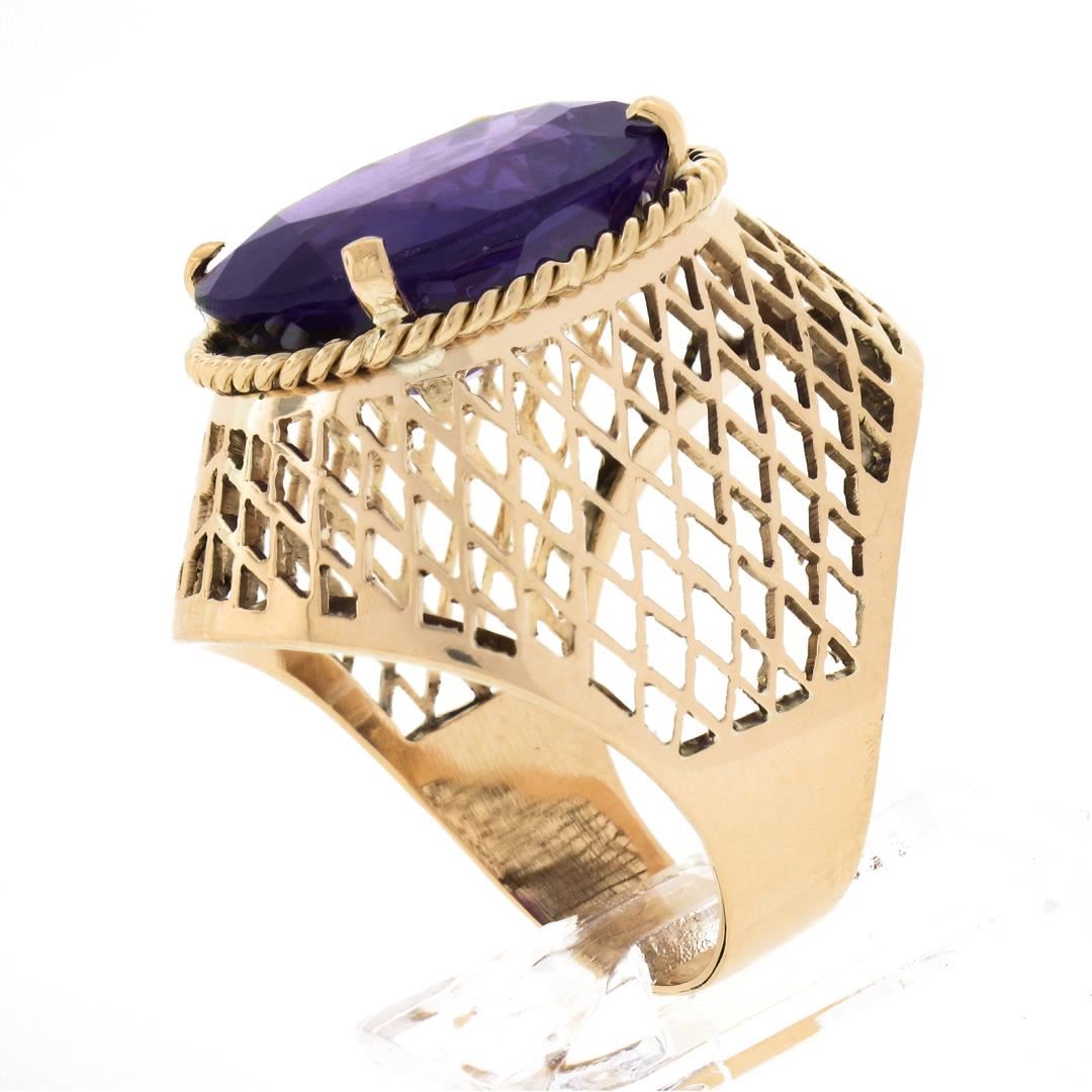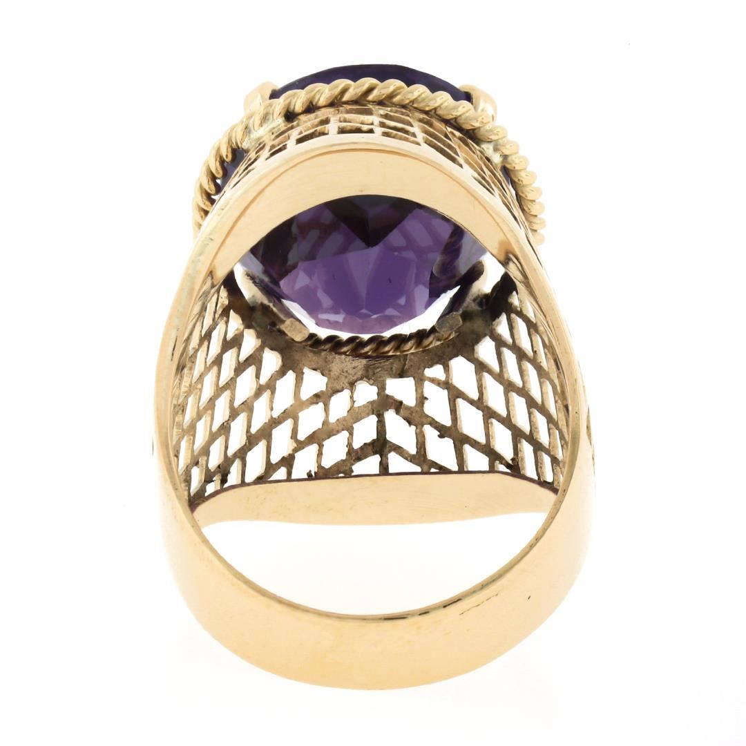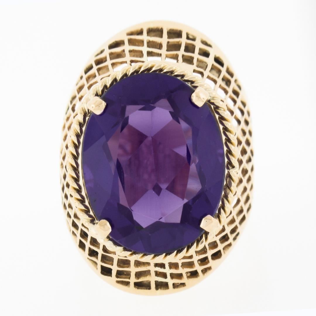 A vintage solid 14k yellow gold ring, with 1 oval cut synthetic alexandrite (17.4x13.65mm). The ring is size 7.0, weighs a total of 8.50 grams, and measures 27.4mm wide.