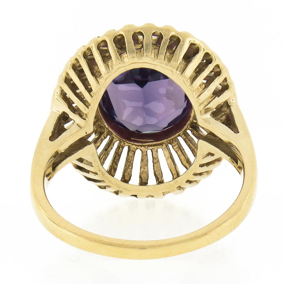 A vintage solid 14k yellow gold solitaire ring, with 1 oval cut synthetic alexandrite (11.9x10mm). The ring is size 6.5, weighs a total of 5.47 grams, and measures 18.4mm wide.