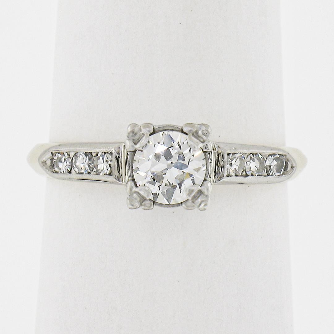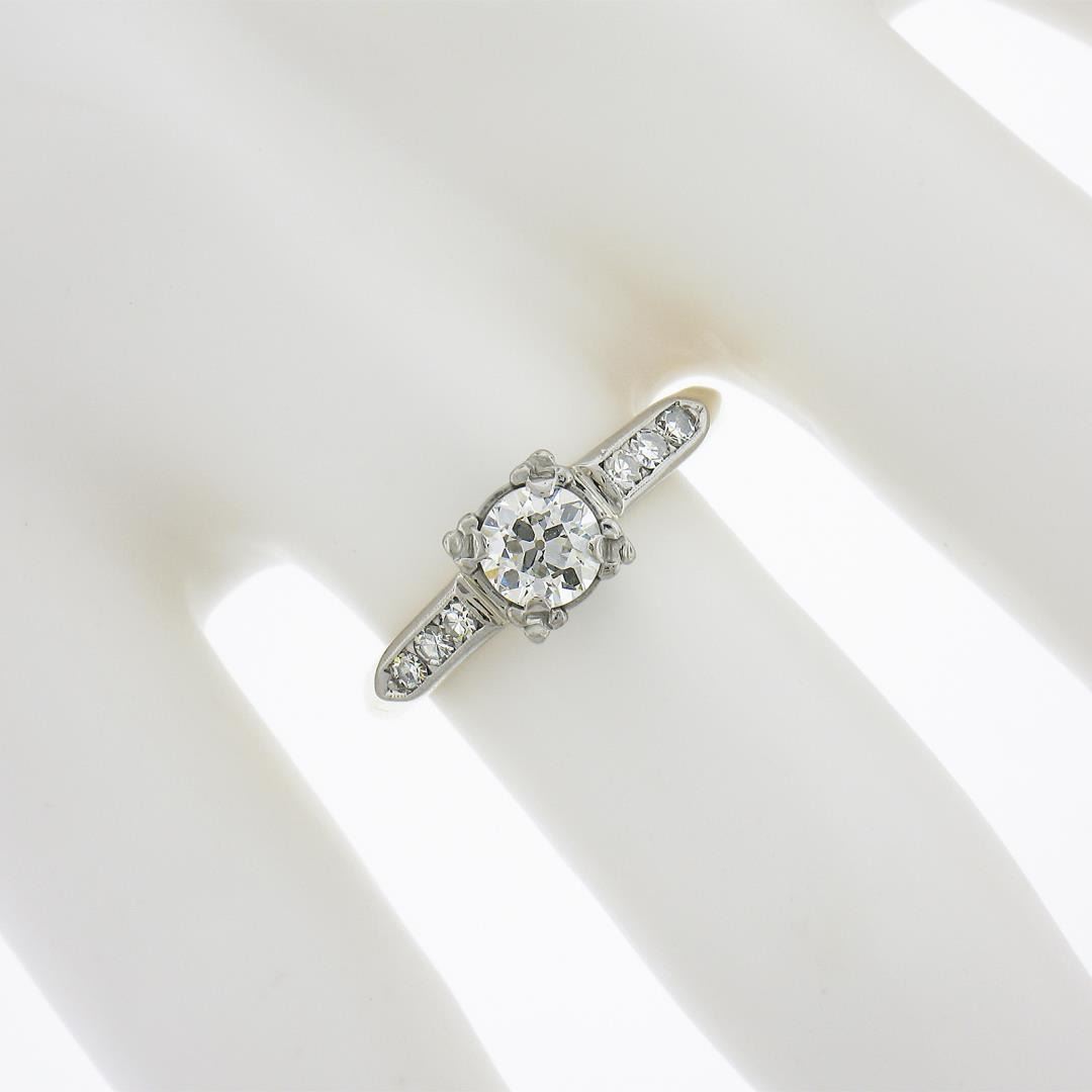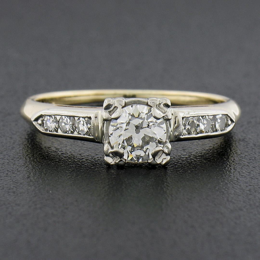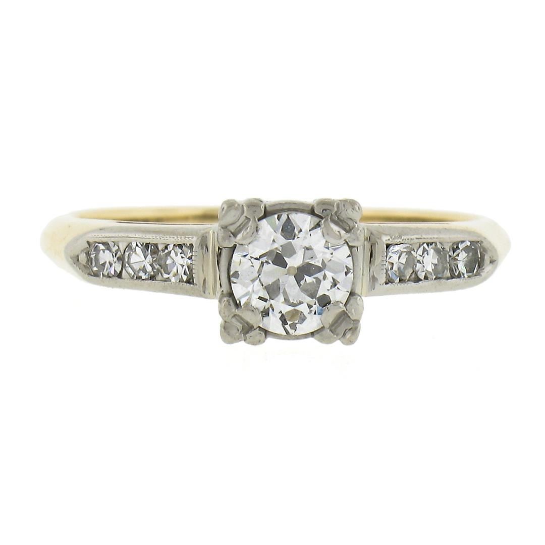 A vintage soldi 14k yellow gold & palladium engagement ring, with 1 old european cut natural diamond (G/H - VS2 ; 0.44ct ), and 6 old single cut natural diamonds (G - VS1/VS2 ; 0.10ctw). The ring is size 6.0, weighs a total of 2.31 grams, and measures 5.7mm wide.