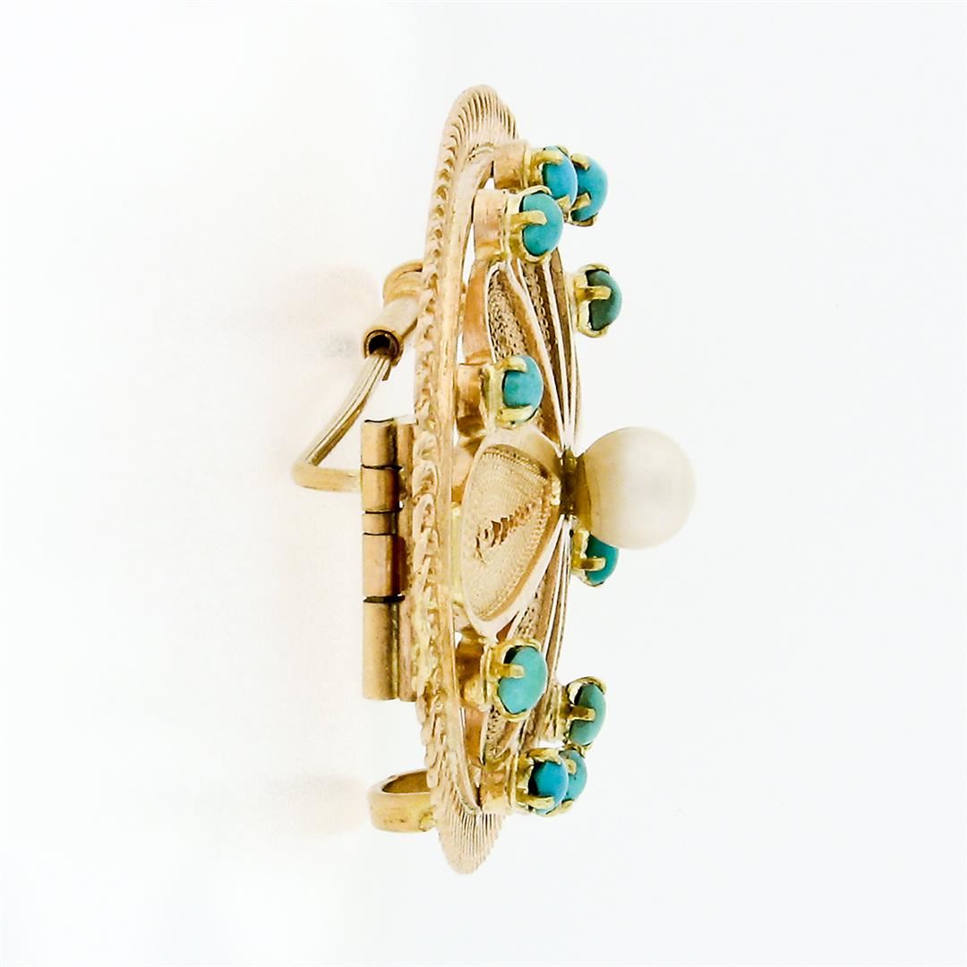 A vintage 14k yellow gold filigree work brooch or pendant with 1 round shaped cultured pearl (5.55mm) surrounded with 10 round cabochon cut natural turquoise (2.85mm). Measures 45.72x35.04mm and weighs a total of 15.00 grams.
