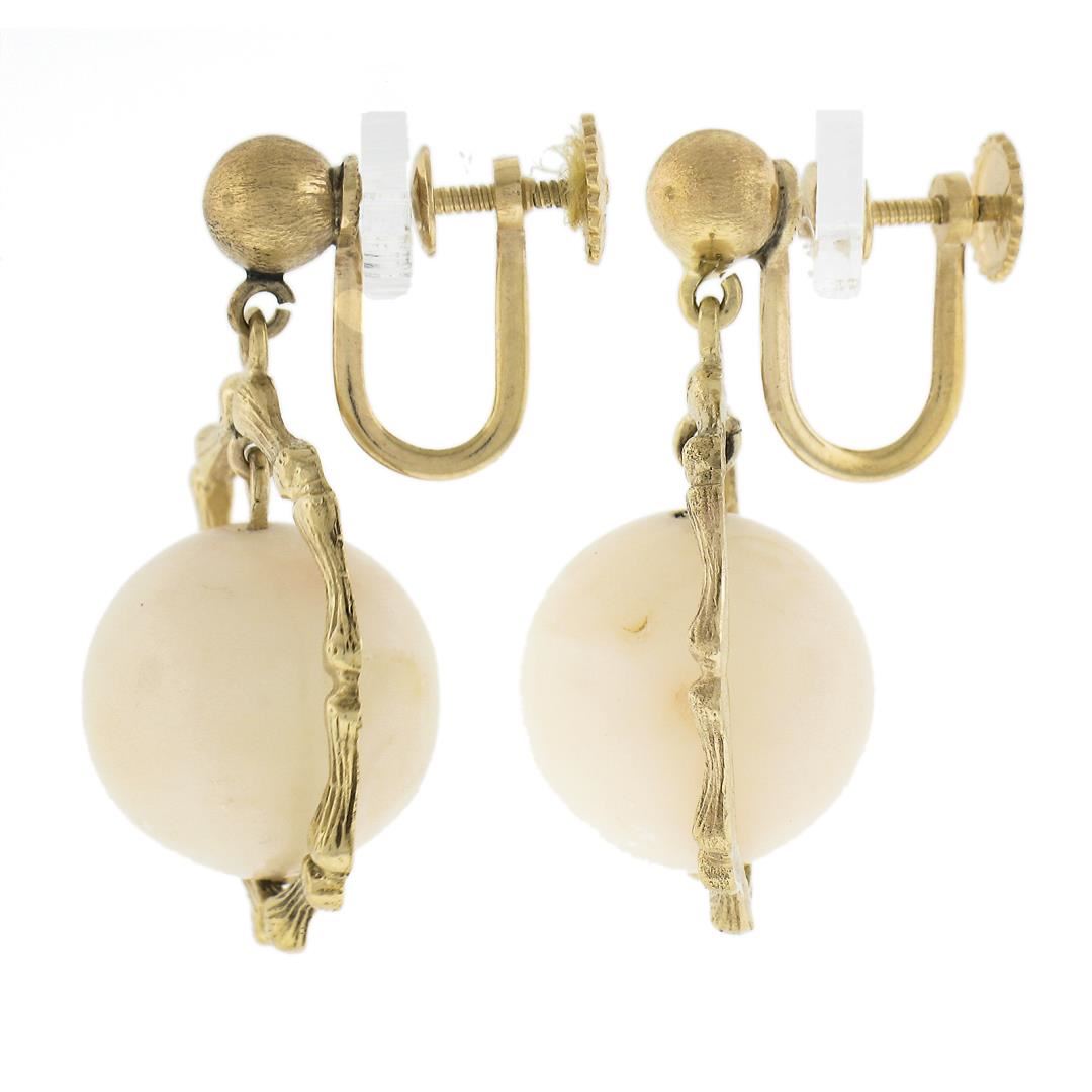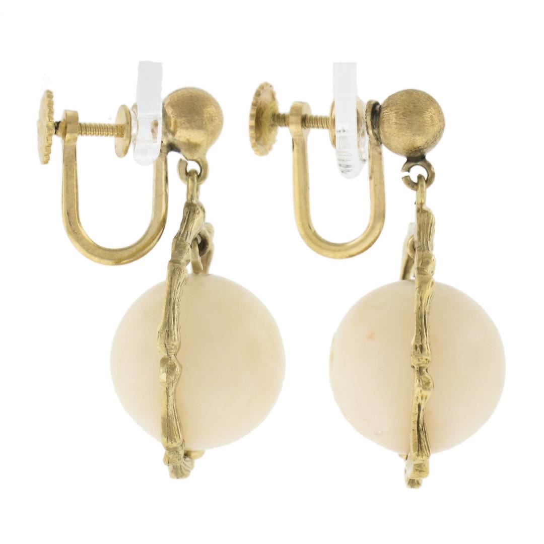 A vintage solid 14k yellow gold dangle earrings, with 2 round shape natural coral (13.1mm each). The earrings measure approximately 28.7x20.7mm and weigh a total of 10.54 grams.