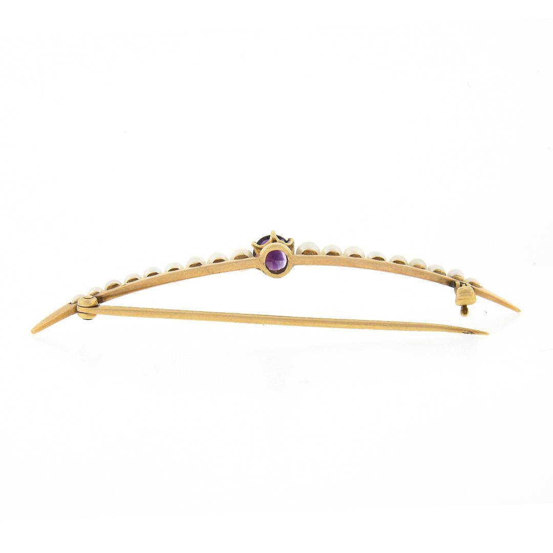 A vintage solid 14k yellow gold & platinum crescent brooch, with 18 round shape cultured seed pearls (2.2mm to 3.2mm ), and 1 round brilliant cut natural amethyst (5.1mm / 0.50ct). Measures 6.35x63.30mm and weighs a total of 3.87 grams.