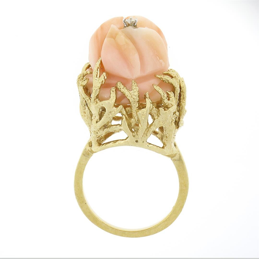 A solid 14k yellow gold freeform ring, with 1 carved rose shape natural coral (12.90x15.60mm), and 1 old single cut natural diamond (H - VS2 ; 0.03ct ). The ring is size 6.0, weighs a total of 10.21 grams, and measures 16.30mm wide.