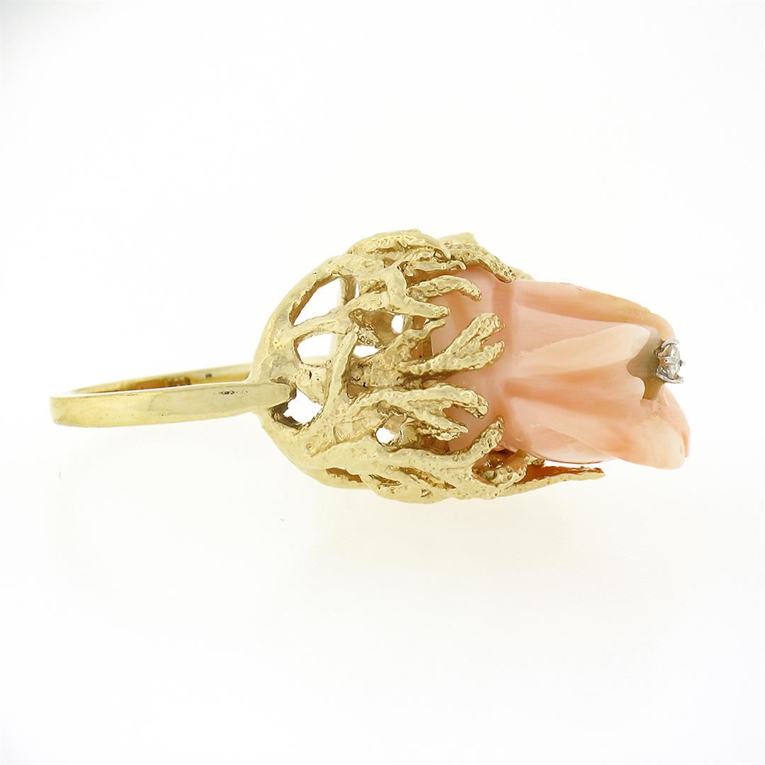 A solid 14k yellow gold freeform ring, with 1 carved rose shape natural coral (12.90x15.60mm), and 1 old single cut natural diamond (H - VS2 ; 0.03ct ). The ring is size 6.0, weighs a total of 10.21 grams, and measures 16.30mm wide.