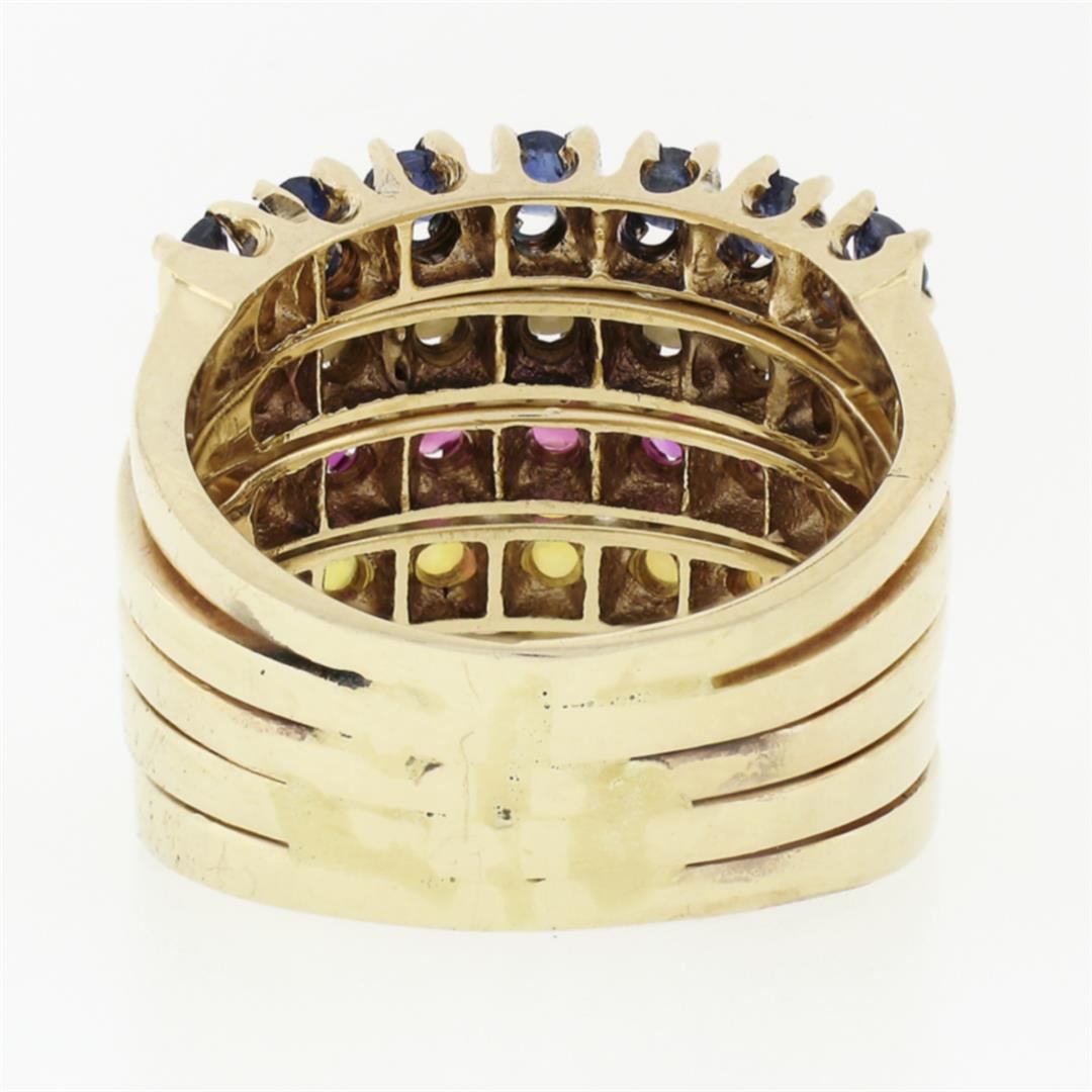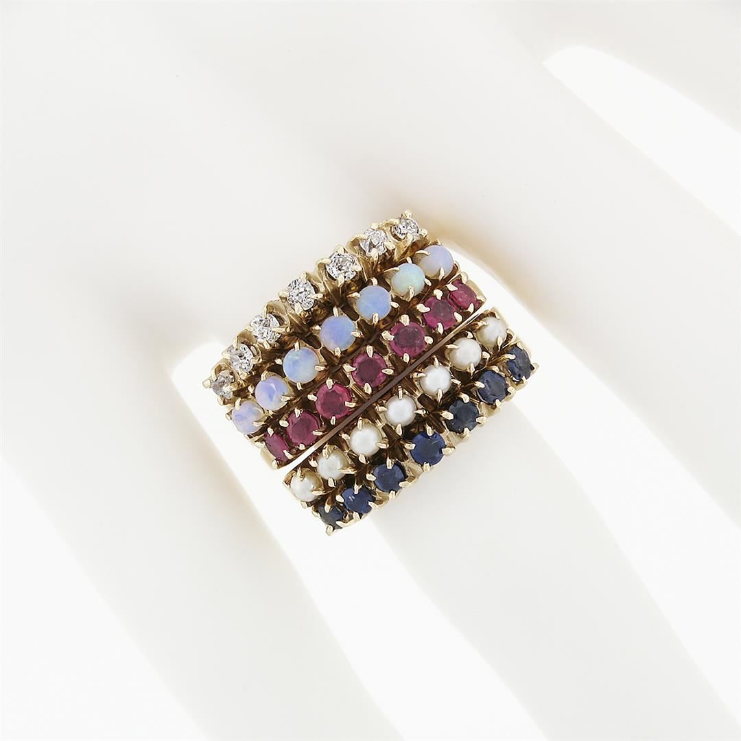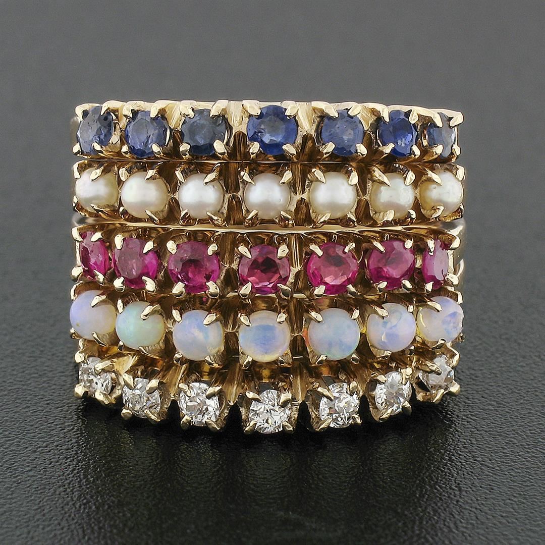 A vintage solid 14k yellow gold 5 band harem stack ring, featuring round shape 7 sapphires (0.60ctw ), 7 rubies (0.70ctw), 7 cultures pearls (2.30mm), 7 natural diamonds (F - VS1/VS2 ; 0.35ctw), 7 natural opals (2.51mm). The ring is size 7, weighs a total of 13.23 grams, and measures 16.96mm wide.