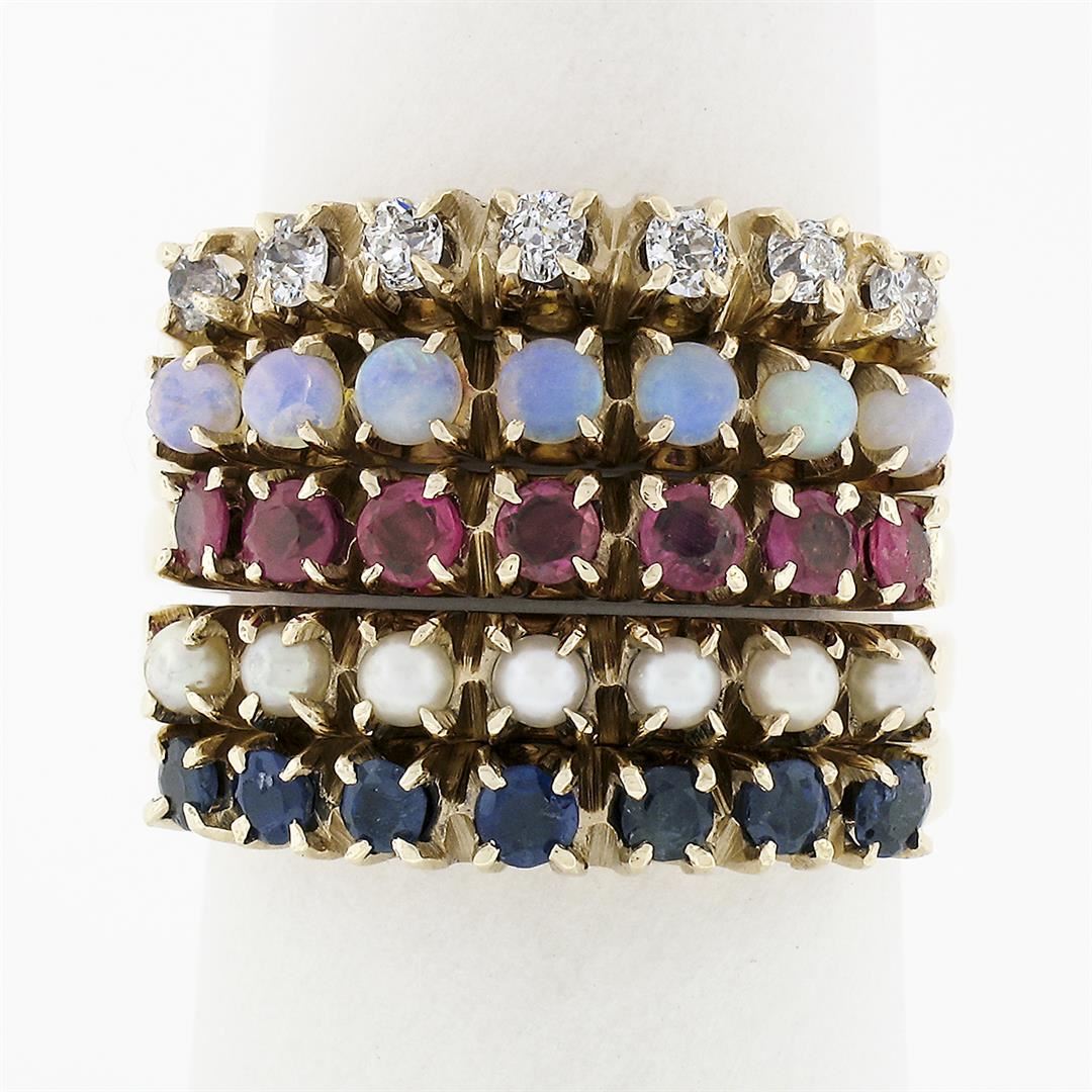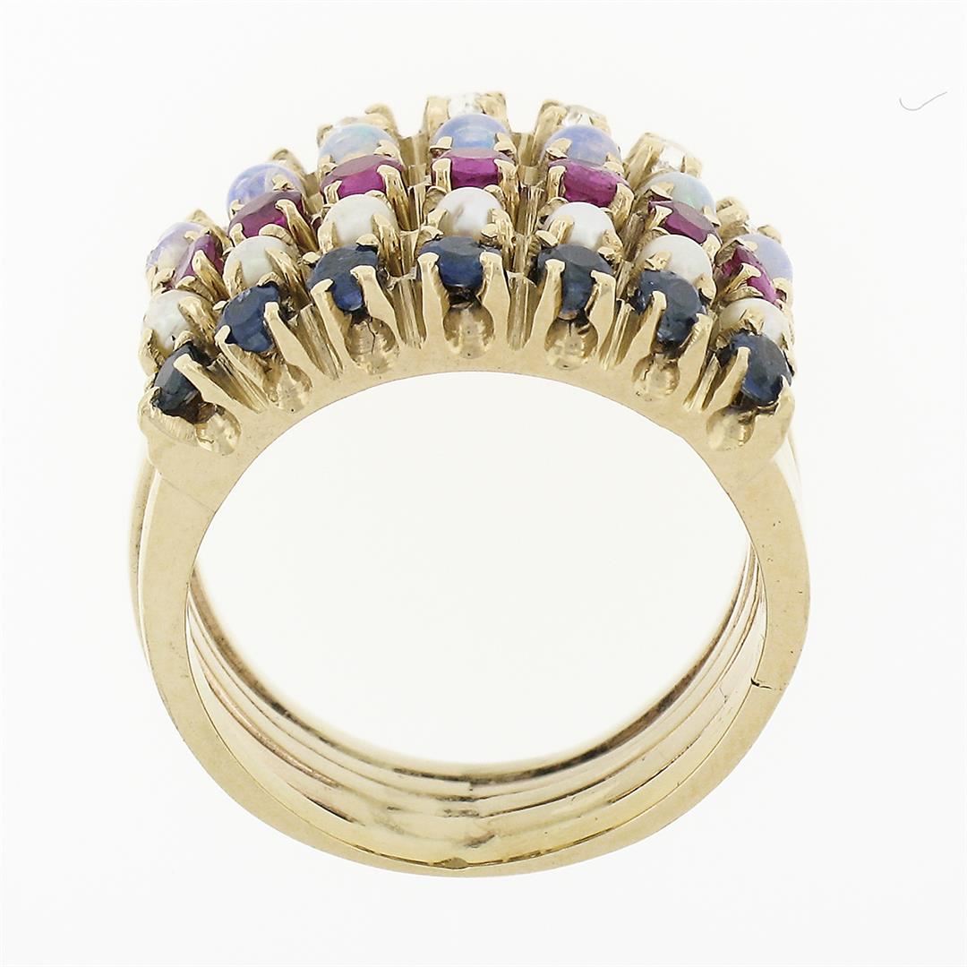 A vintage solid 14k yellow gold 5 band harem stack ring, featuring round shape 7 sapphires (0.60ctw ), 7 rubies (0.70ctw), 7 cultures pearls (2.30mm), 7 natural diamonds (F - VS1/VS2 ; 0.35ctw), 7 natural opals (2.51mm). The ring is size 7, weighs a total of 13.23 grams, and measures 16.96mm wide.