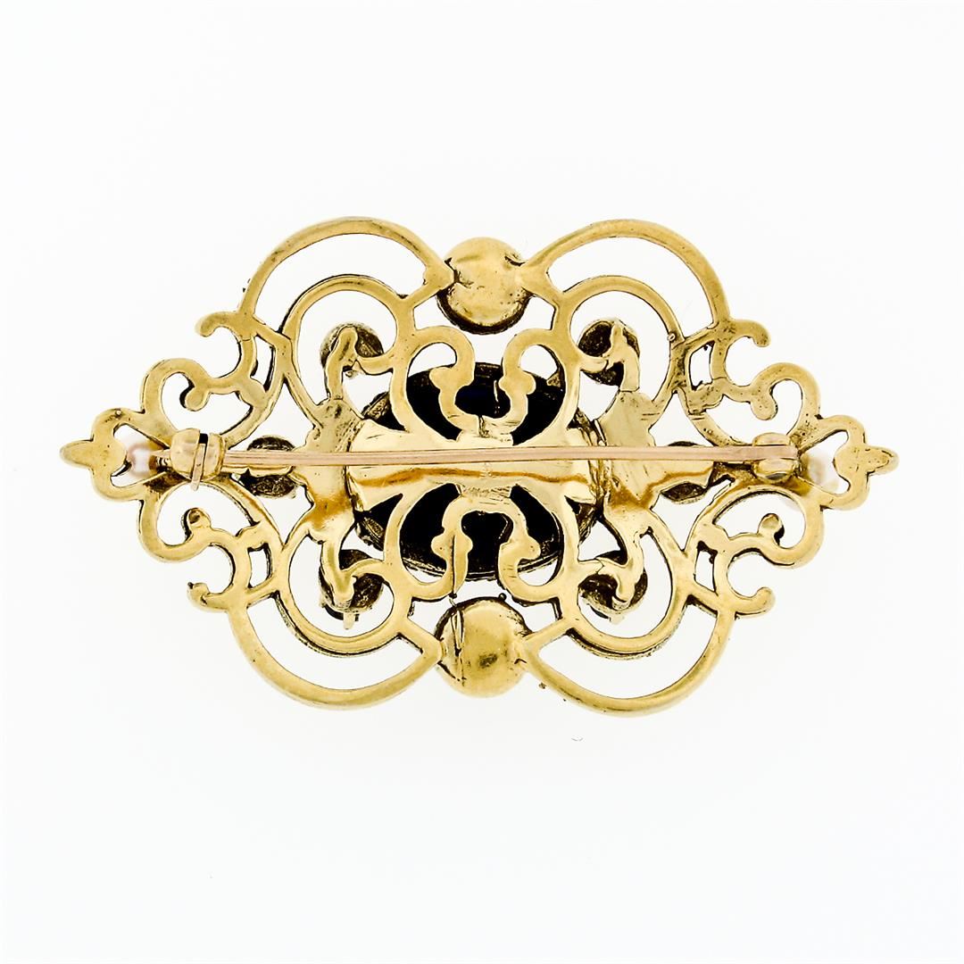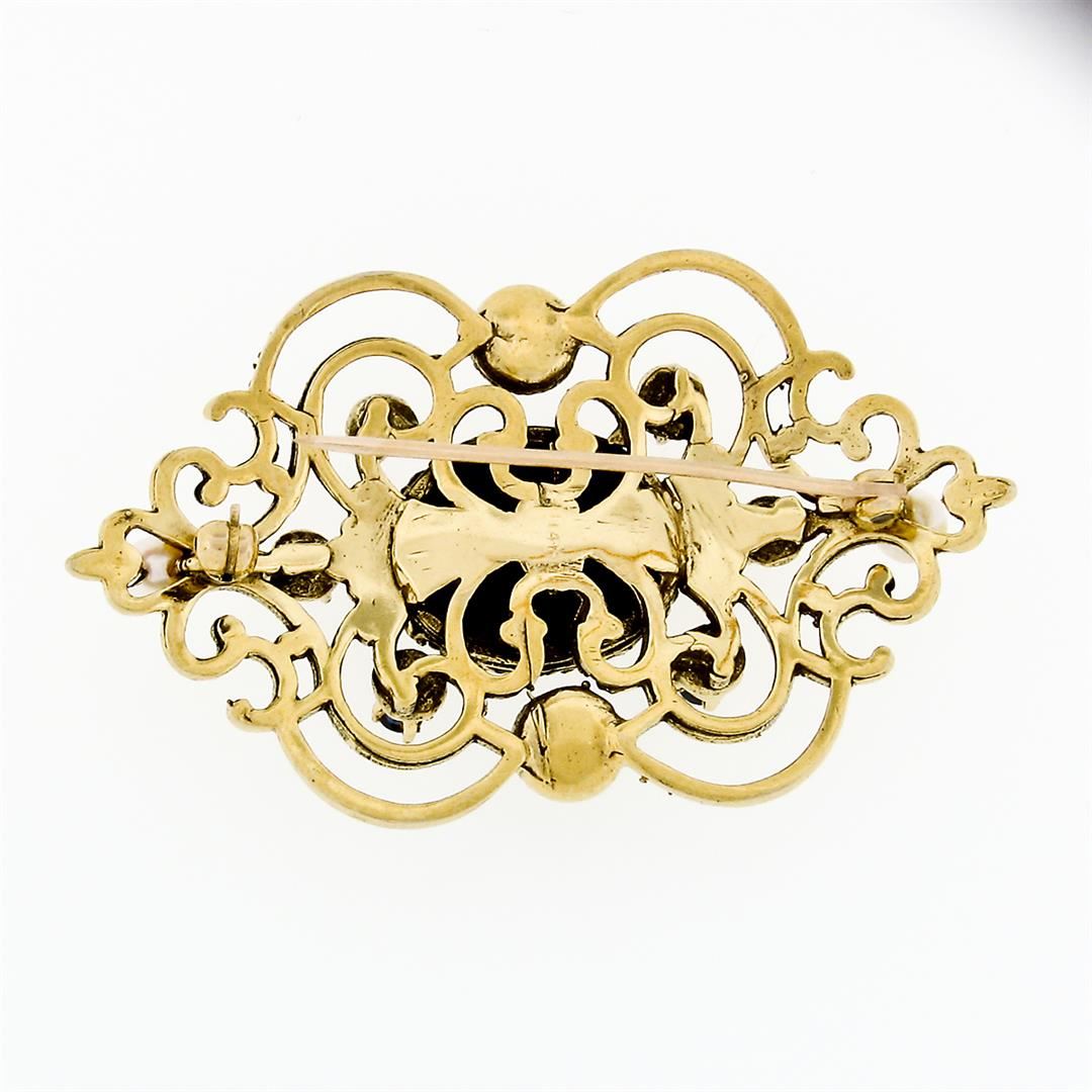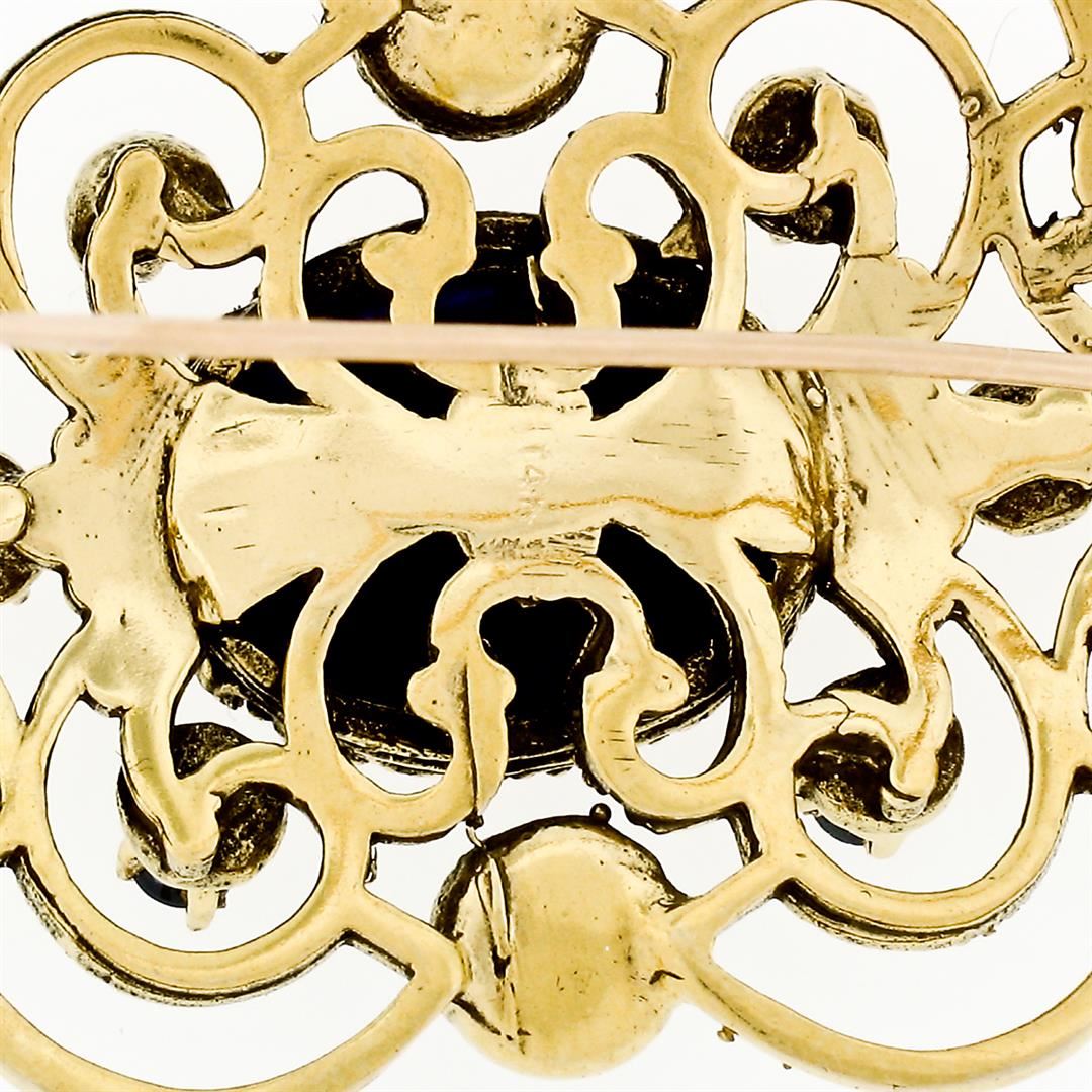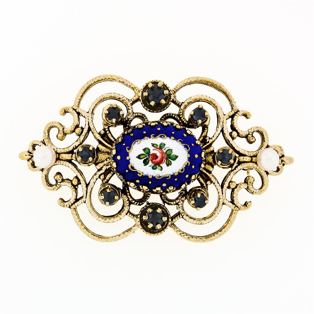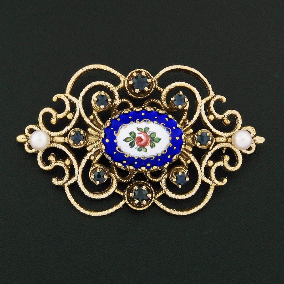 A vintage solid 14k yellow gold brooch with multi-color enamel, 8 old round cut natural sapphires (0.69ctw), and 2 round white cultured pearls (4.0mm). Measures 49.47x30.06mm and weighs a total of 13.08 grams.