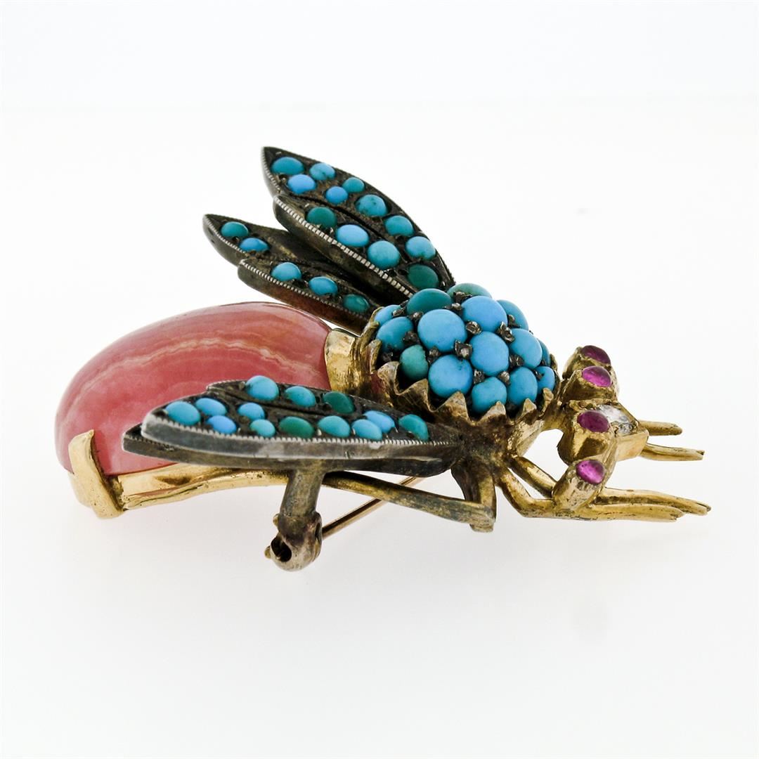 A vintage 14k yellow gold and sterling silver bee fly pin brooch, featuring 55 cabochon cut natural turquoises (1.5mm-3.3mm), and 4 cabochon cut natural rubies (0.20ctw ), with 1 transitional cut natural diamond ( G- VS2; 0.09ctw), and 1 oval cabochon cut natural rhodochrosite (20.25x15.0mm). Measures 41.75x42.30mm and weighs a total of 18.79 grams.