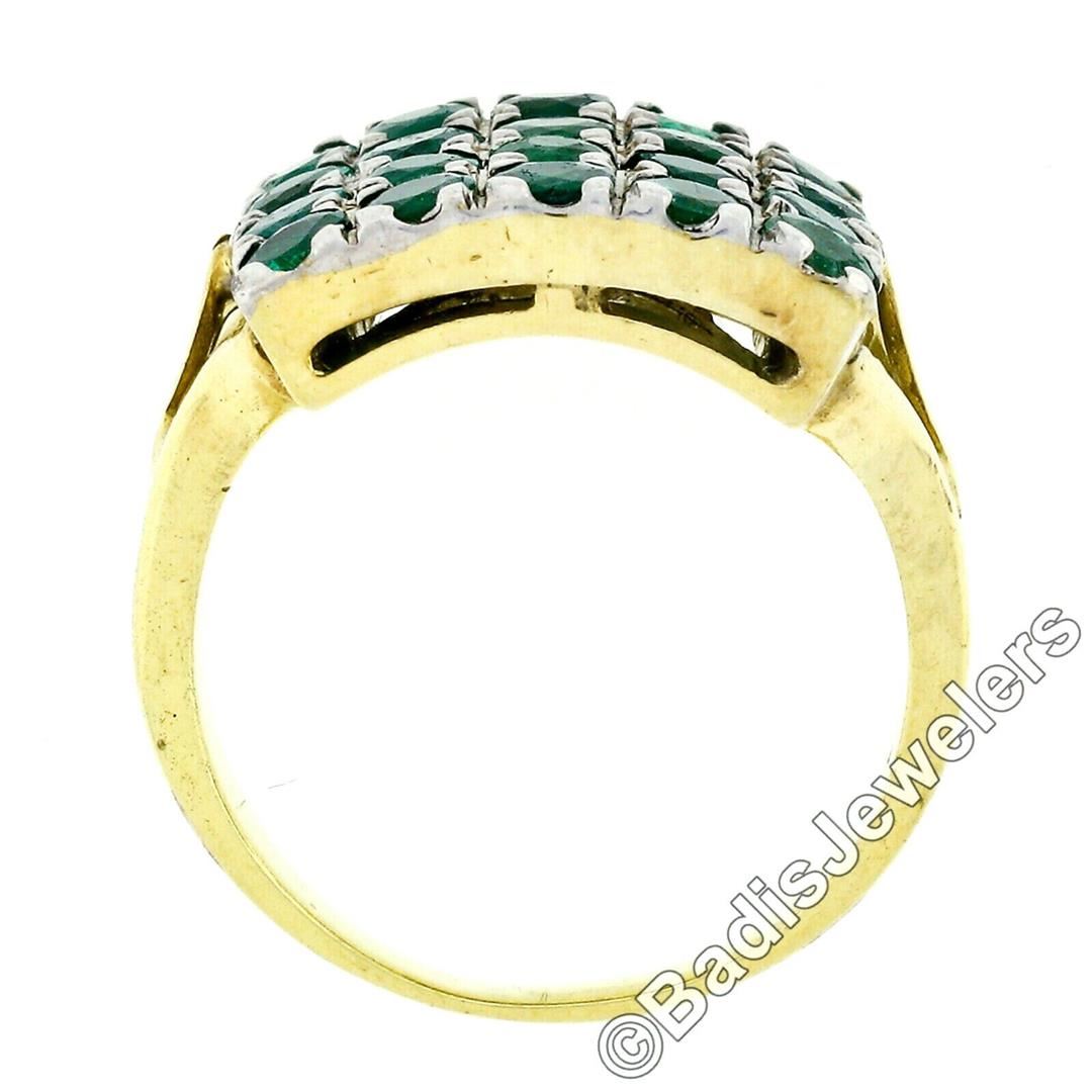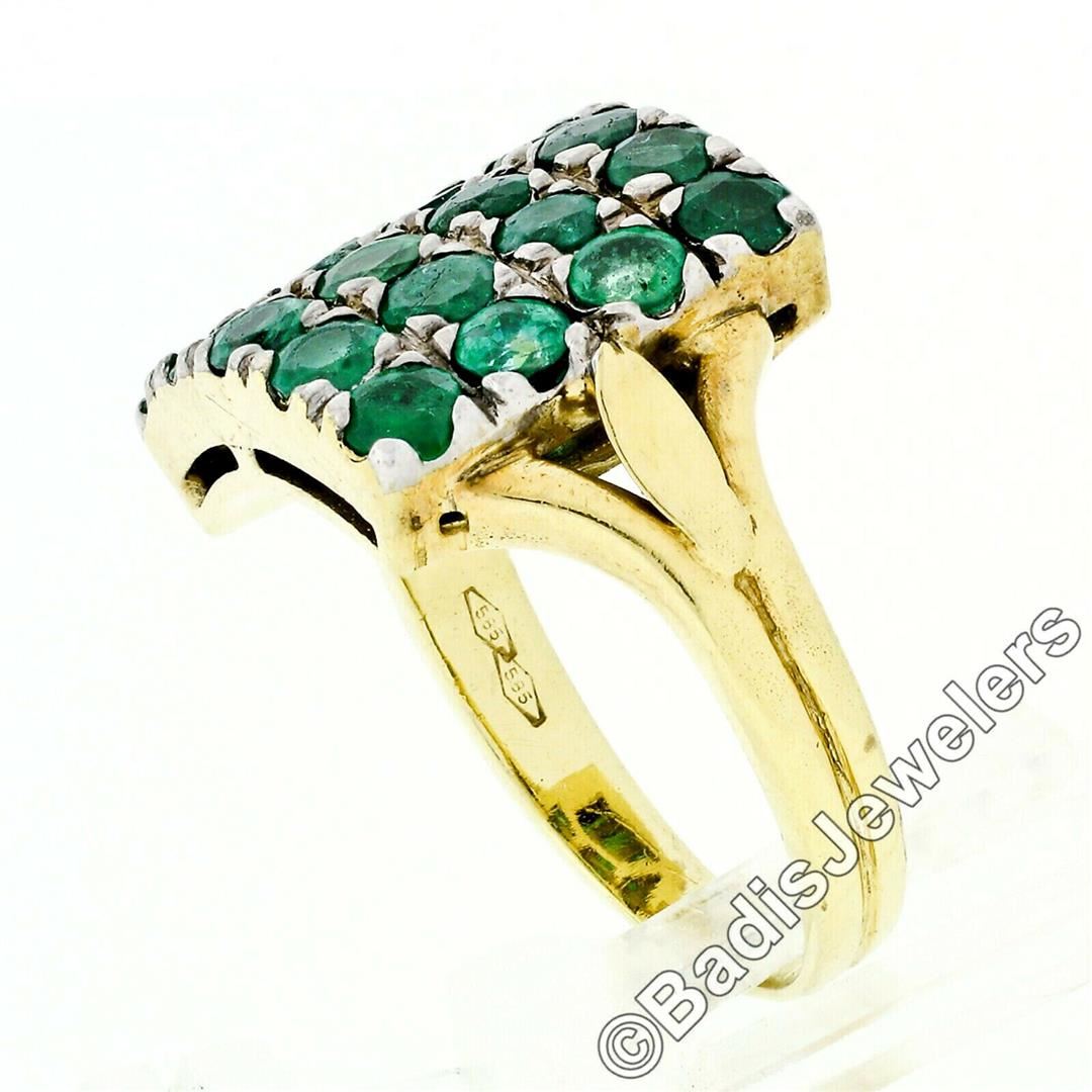 A vintage solid 14k yellow gold and silver top platter ring, with 20 round brilliant cut natural emerlads (2.40ctw). The ring is size 8.5, weighs a total of 8.83 grams, and measures 14.70mm wide.