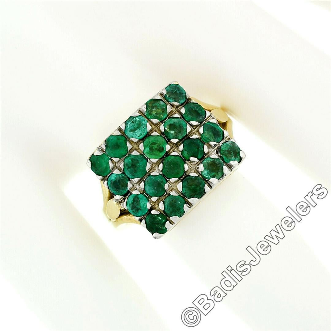 A vintage solid 14k yellow gold and silver top platter ring, with 20 round brilliant cut natural emerlads (2.40ctw). The ring is size 8.5, weighs a total of 8.83 grams, and measures 14.70mm wide.