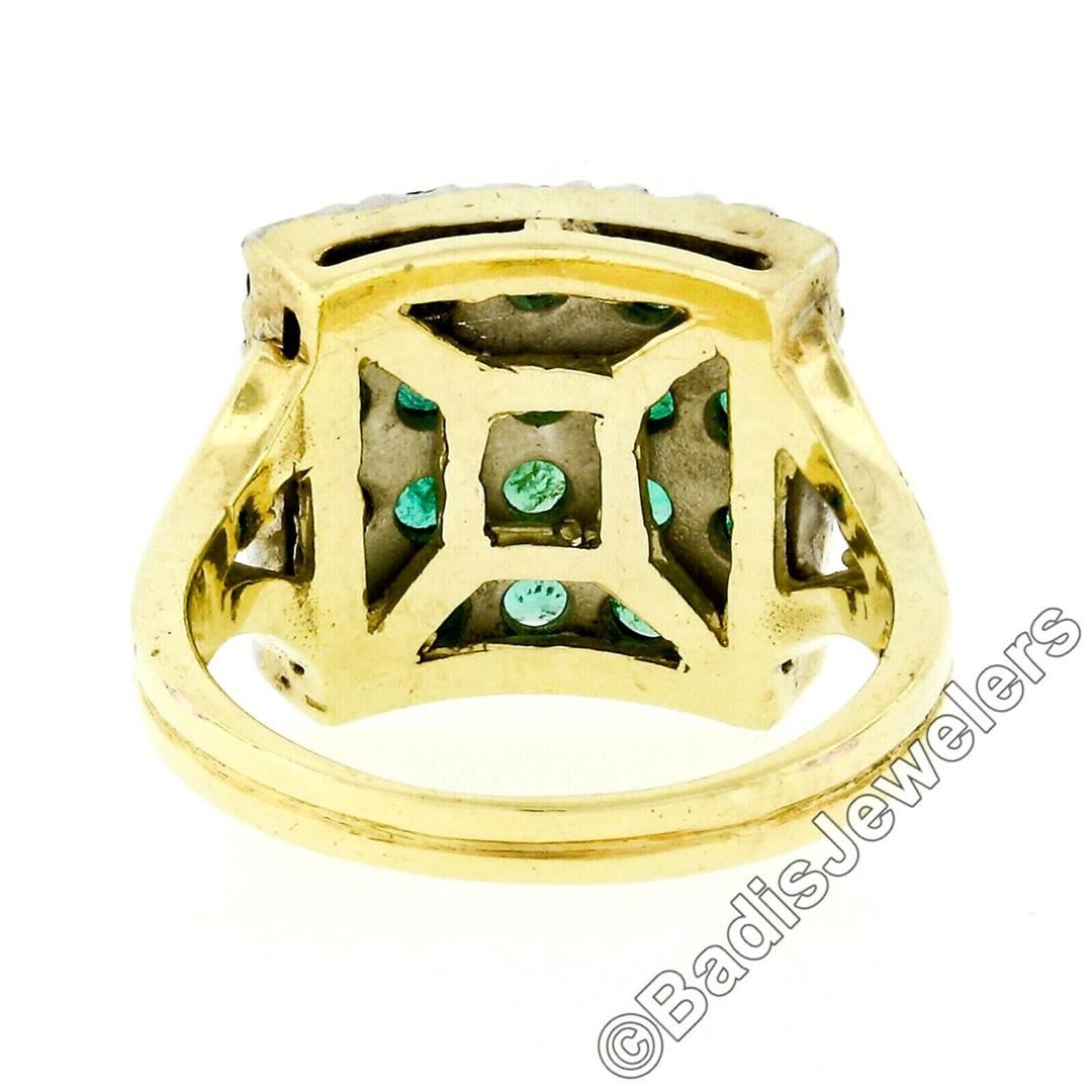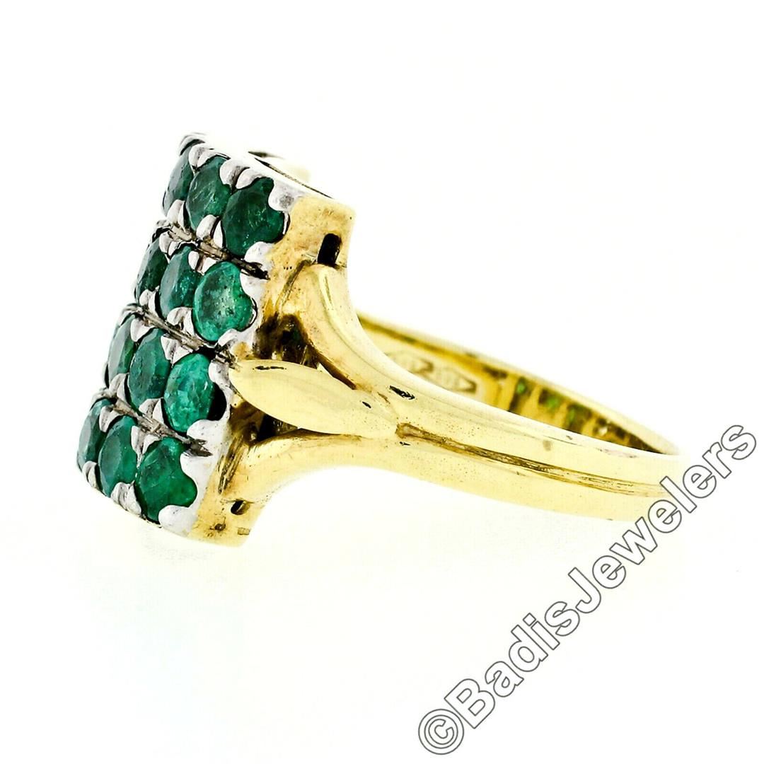 A vintage solid 14k yellow gold and silver top platter ring, with 20 round brilliant cut natural emerlads (2.40ctw). The ring is size 8.5, weighs a total of 8.83 grams, and measures 14.70mm wide.