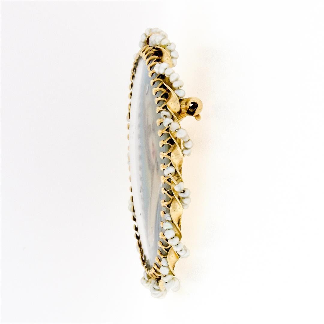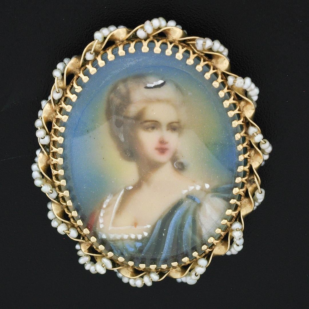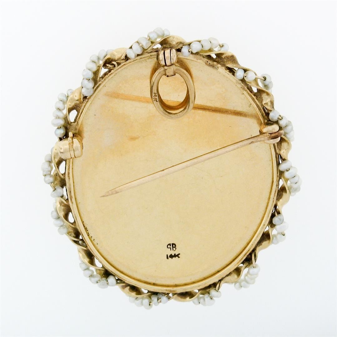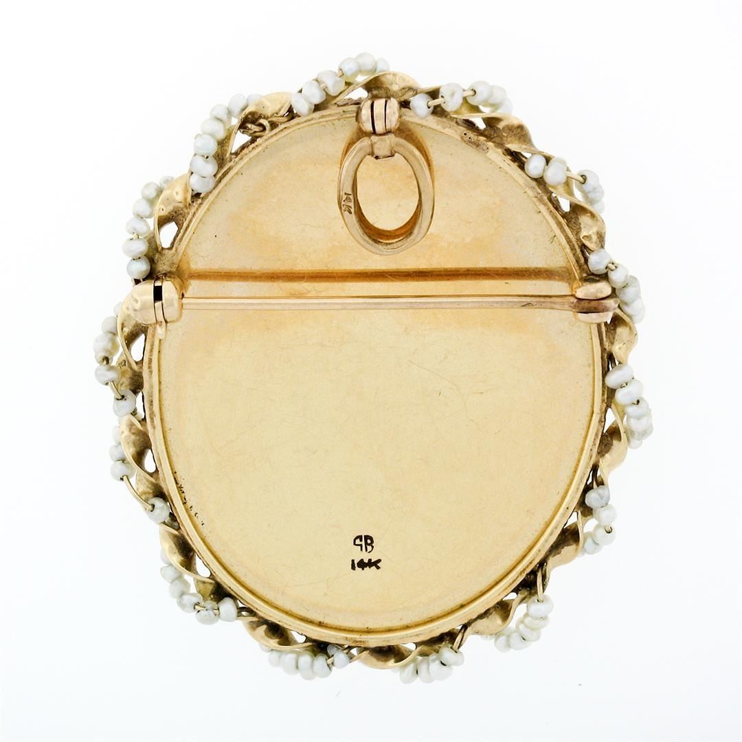A vintage solid 14k yellow gold painted brooch pendant, with 94 baroque bead shapes natural seed pearls (1.8mm). Measures 46.52x33.75mm and weighs a total of 8.13 grams.