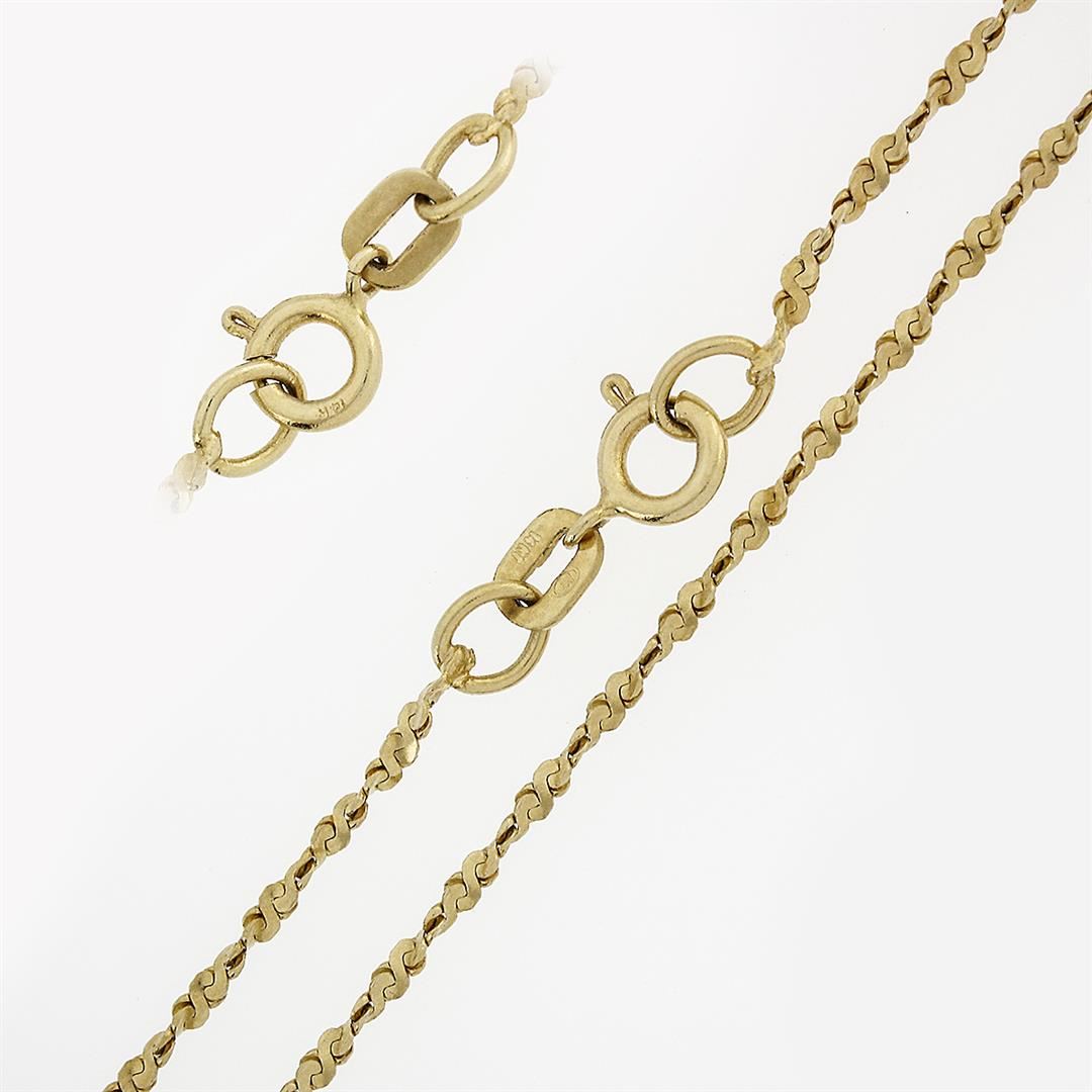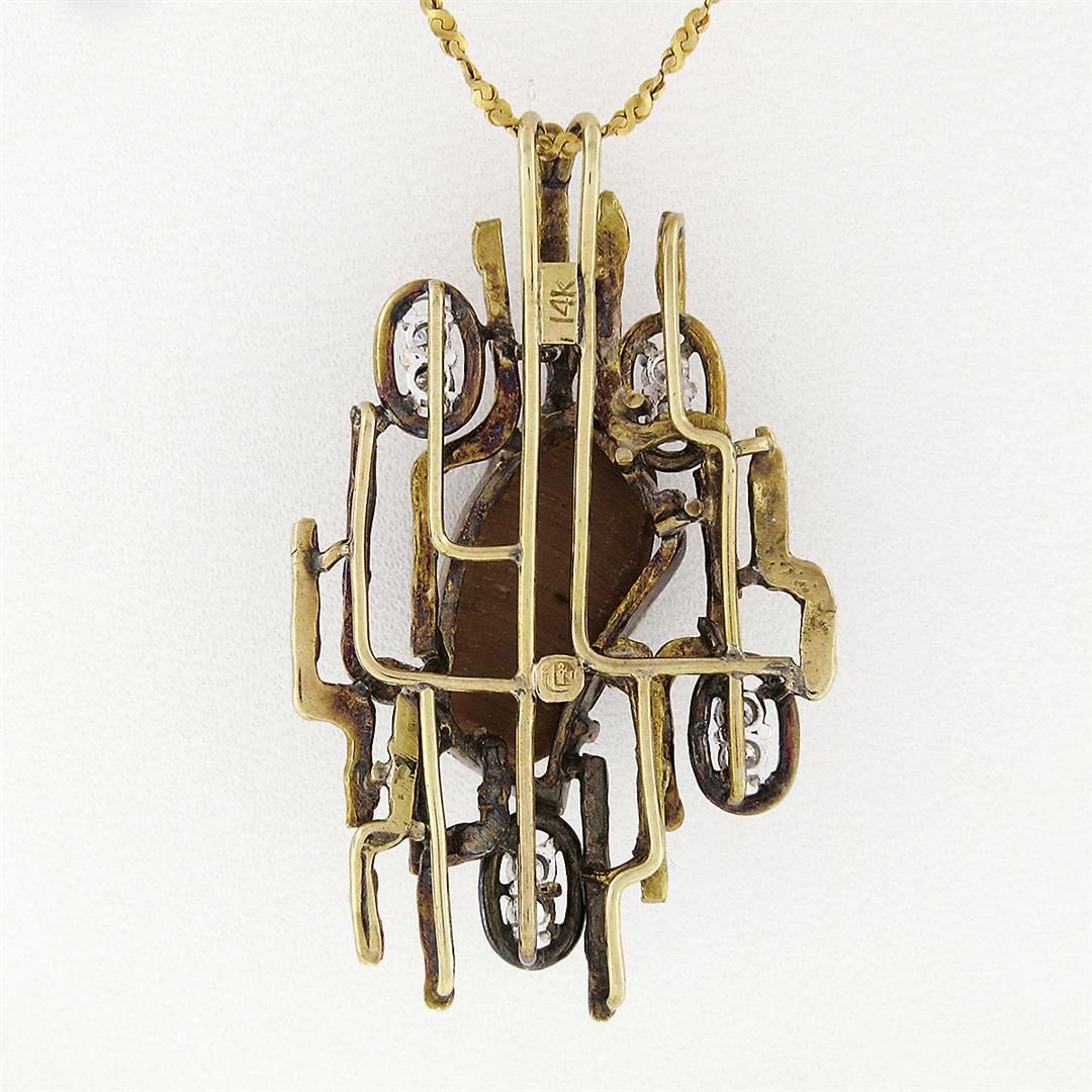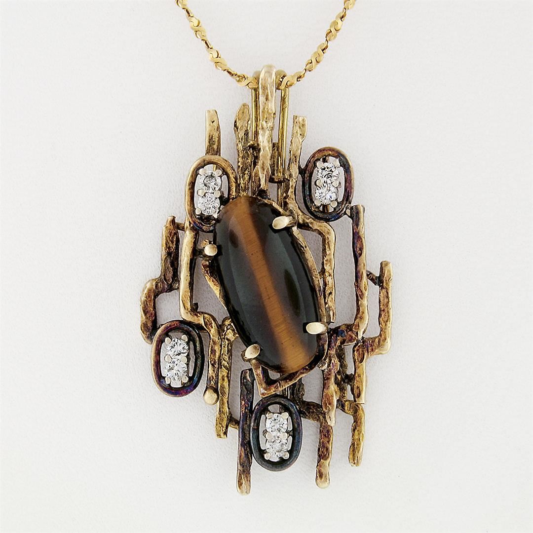 A vintage solid 14k yellow gold pendant necklace, with 1 long oval cut natural tiger's eye (8.8x17.7mm), & 8 round brilliant cut natural diamonds (G/H- VS2/SI2; 0.28ctw). The pendant weighs a total of 11.90 grams, measures 41.9x25.2mm including the bail, and 30 inch fancy link chain.