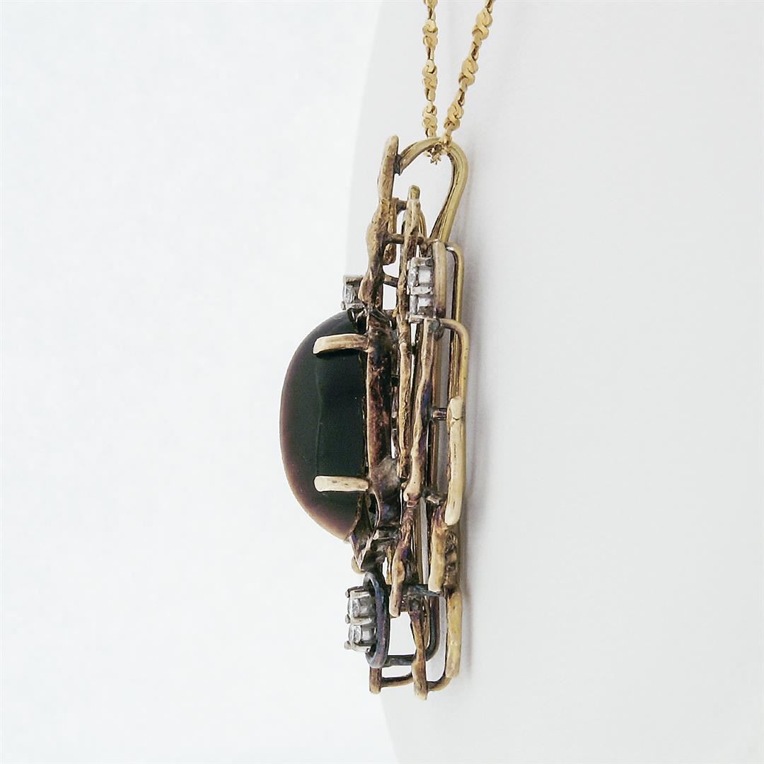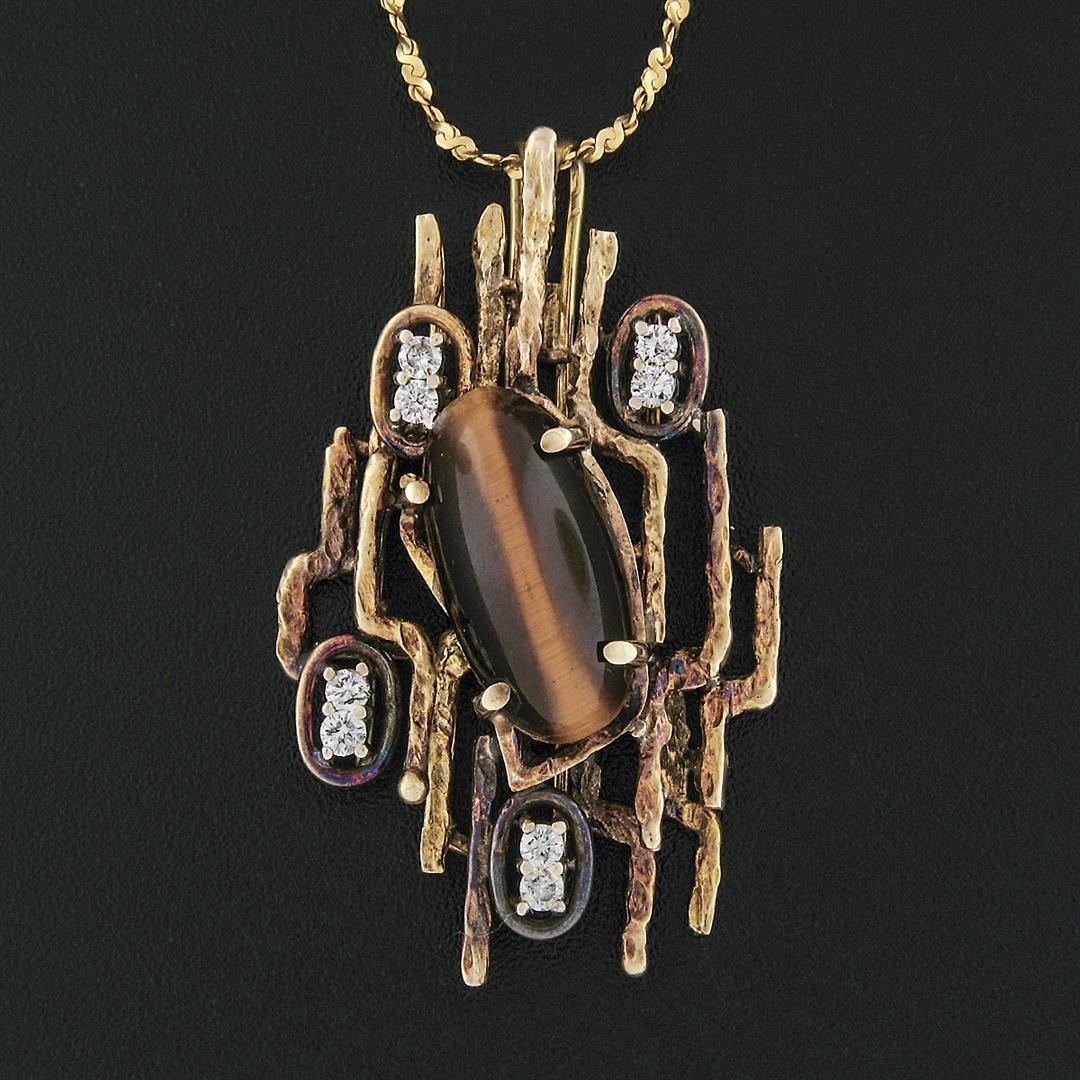 A vintage solid 14k yellow gold pendant necklace, with 1 long oval cut natural tiger's eye (8.8x17.7mm), & 8 round brilliant cut natural diamonds (G/H- VS2/SI2; 0.28ctw). The pendant weighs a total of 11.90 grams, measures 41.9x25.2mm including the bail, and 30 inch fancy link chain.