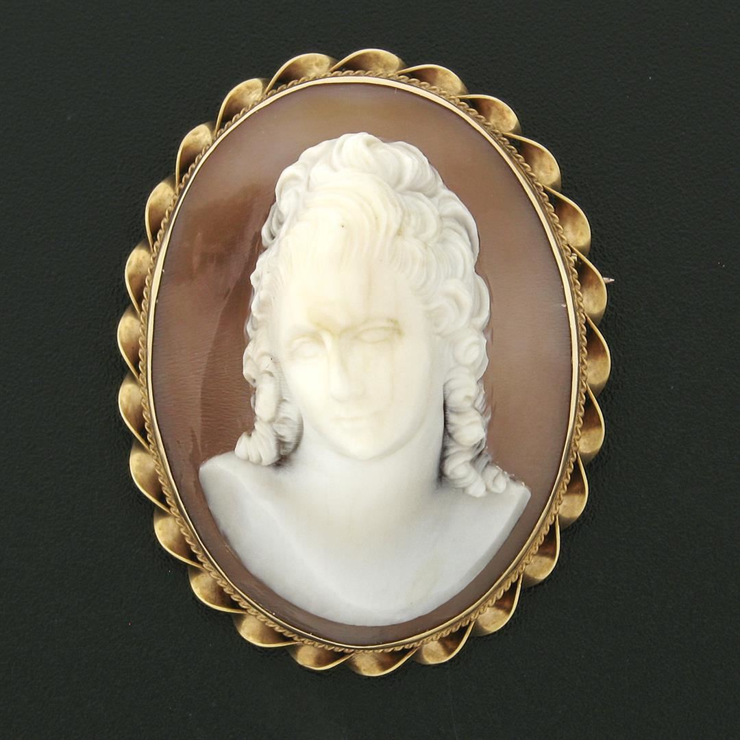 A vintage solid 14k yellow gold 3D brooch pendant, with 1 oval shape carved cameo shell (40.2x30.2mm). Measures 47.49x35.86mm and weighs a total of 13.32 grams.