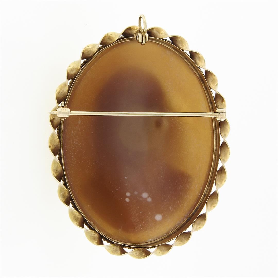 A vintage solid 14k yellow gold 3D brooch pendant, with 1 oval shape carved cameo shell (40.2x30.2mm). Measures 47.49x35.86mm and weighs a total of 13.32 grams.