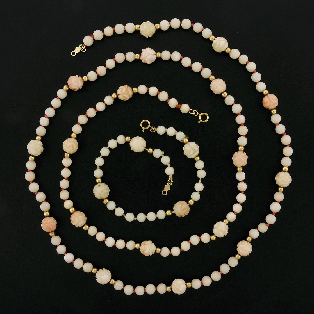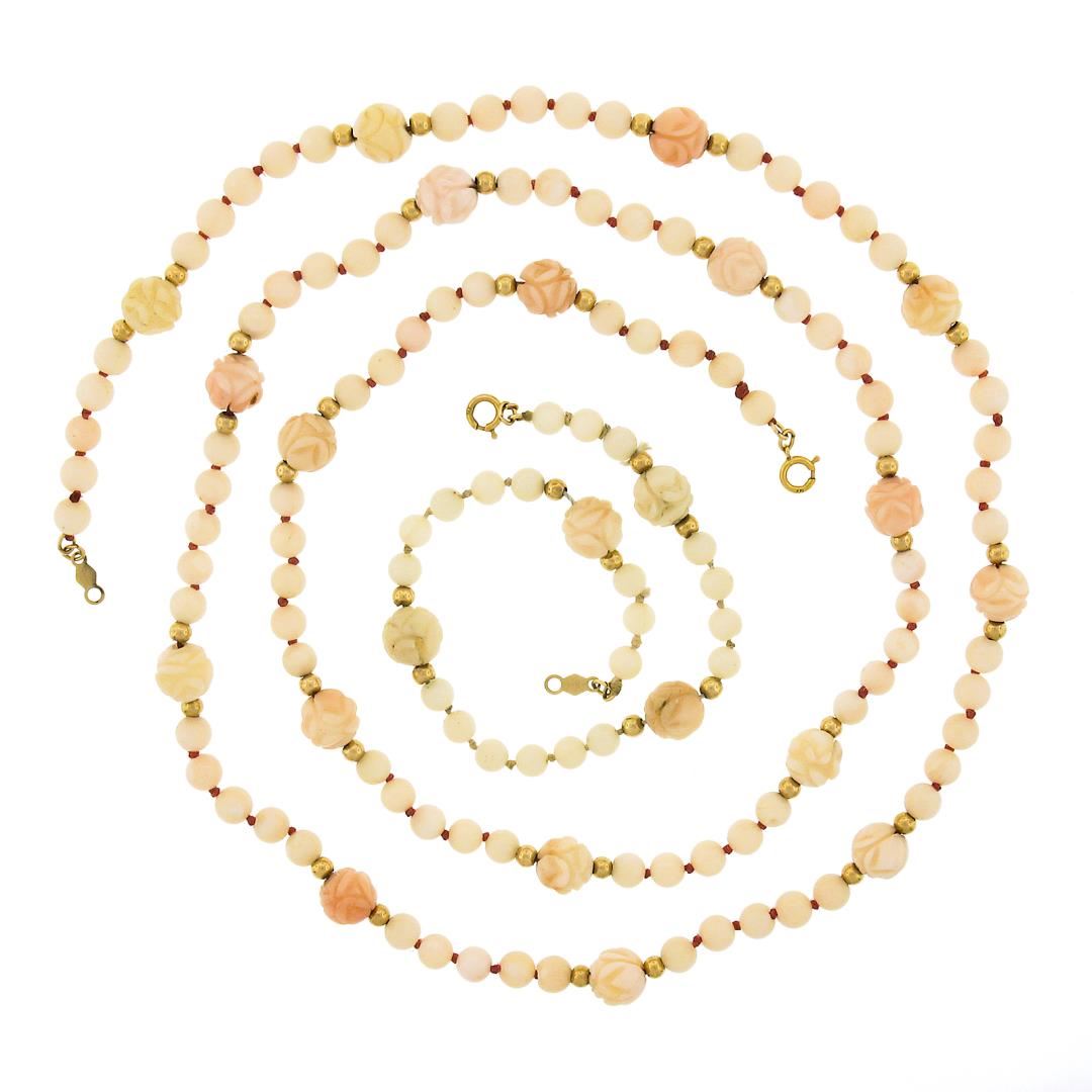 A vintage sp;od 14k yellow gold set of necklace & bracelet, featuring numerous of round bead shape natural carved corals (4.9-8.0mm each). It weighs a total of 32.14 grams, measures 8.0mm wide, the bracelet measures 7 inches in length, and the necklace measures 30 inches in length.
