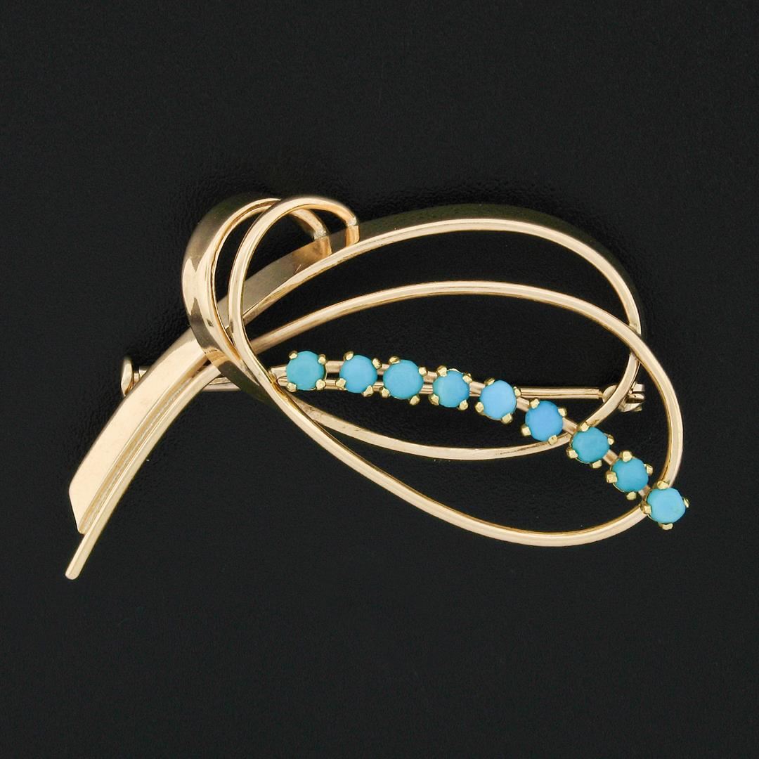 A vintage solid 14k rose gold pin brooch, with 9 round cabochon cut natural turquoise (2.8-2.85mm). Measures 45.8x30.1mm and weighs a total of 7.81 grams.