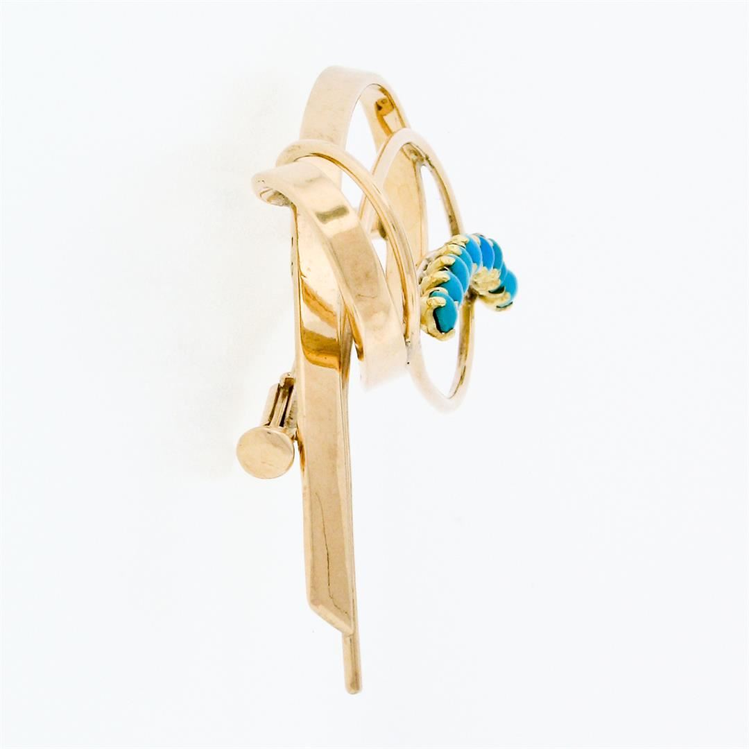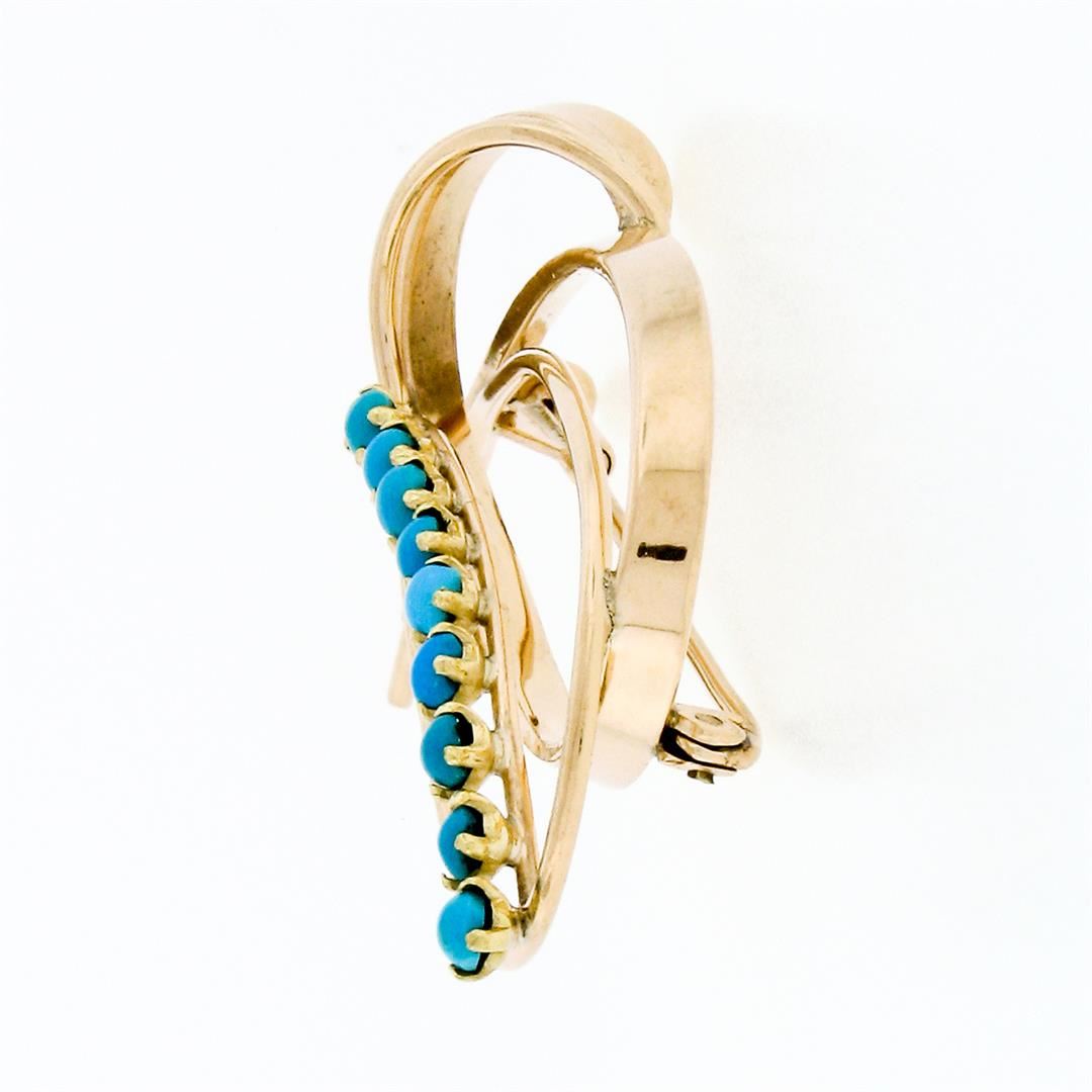 A vintage solid 14k rose gold pin brooch, with 9 round cabochon cut natural turquoise (2.8-2.85mm). Measures 45.8x30.1mm and weighs a total of 7.81 grams.