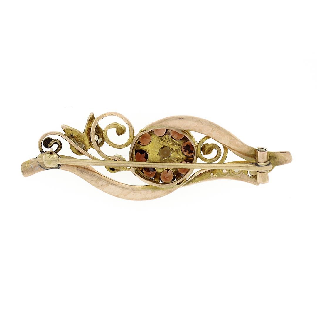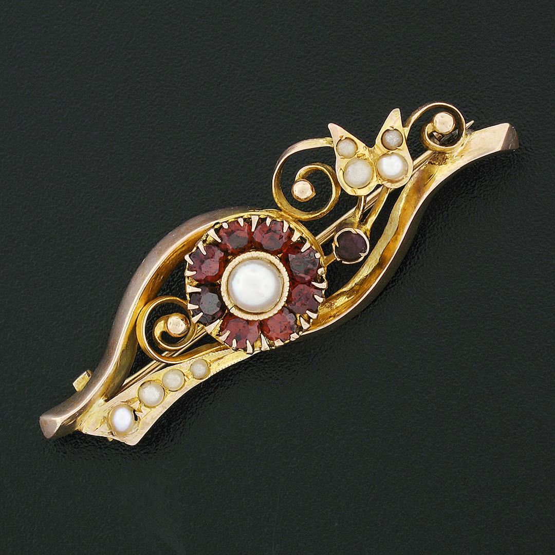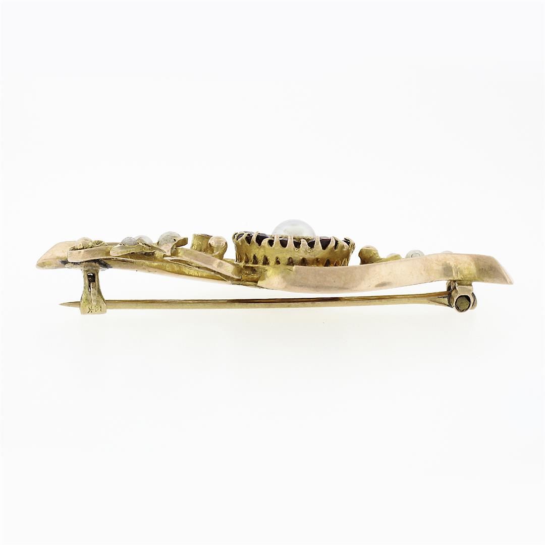 A vintage solid 14k rosy yellow gold pin brooch, with 8 round cut natural garnets (1.04ct ), with 1 round cut natural ruby (0.12ct), 1 round shape cultured mabe pearl (4.75mm), & 8 round shape cultured seed pearls (2.3 to 1.5mm). Measures 14.75x46.1mm and weighs a total of 4.17 grams.