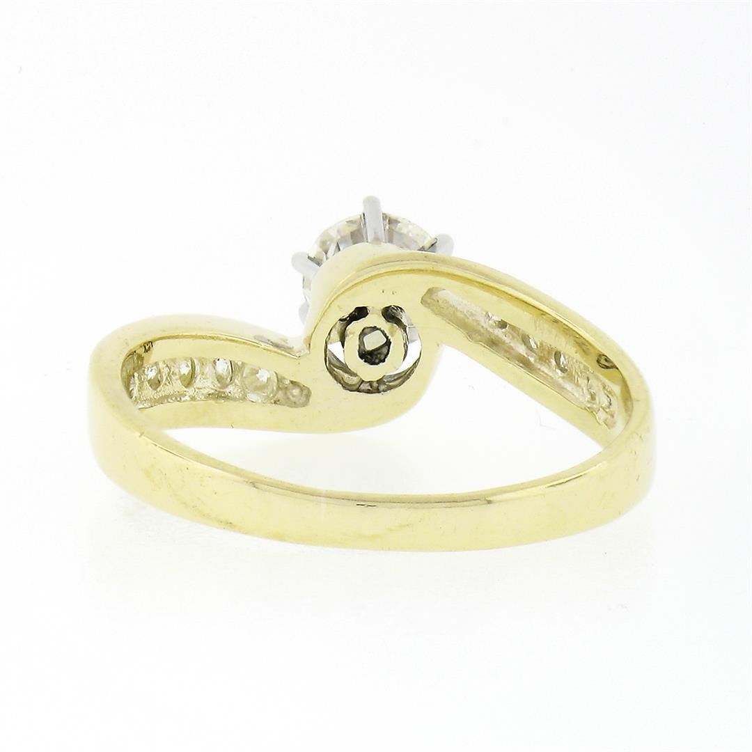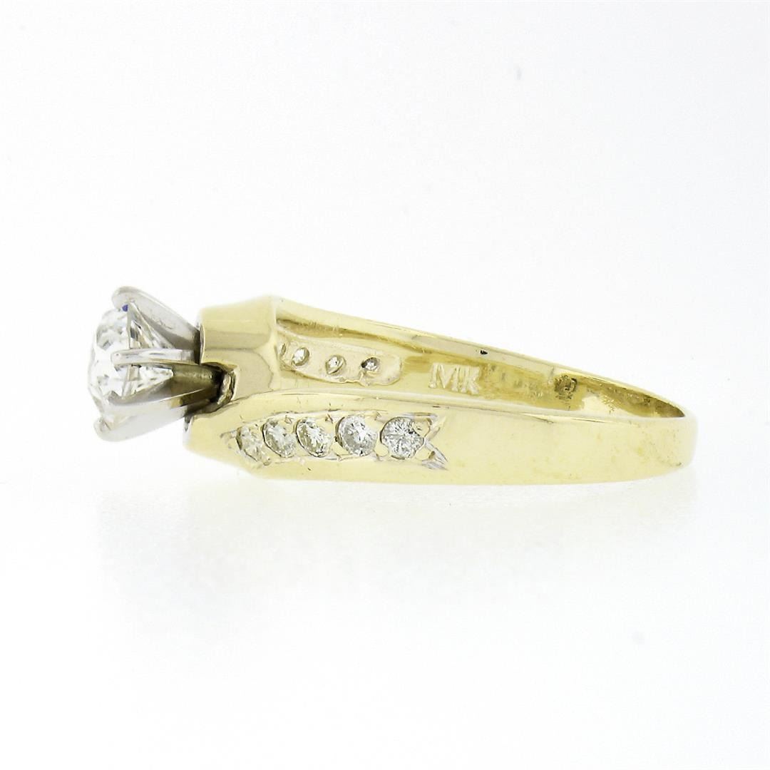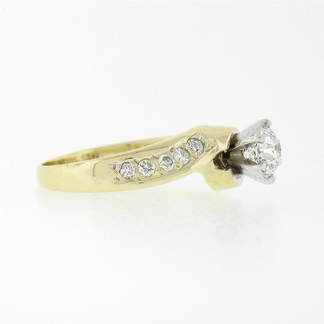 A vintage solid 14k yellow & white gold engagement ring, featuring 1 old european cut natural diamond (G - VS2 ; 0.54ct ), & 10 round briliiant cut natural diamonds (G/H - SI1/SI2 ; 0.20ctw). The ring is size 5.5, weighs a total of 2.59 grams, and measures 6.1mm wide.