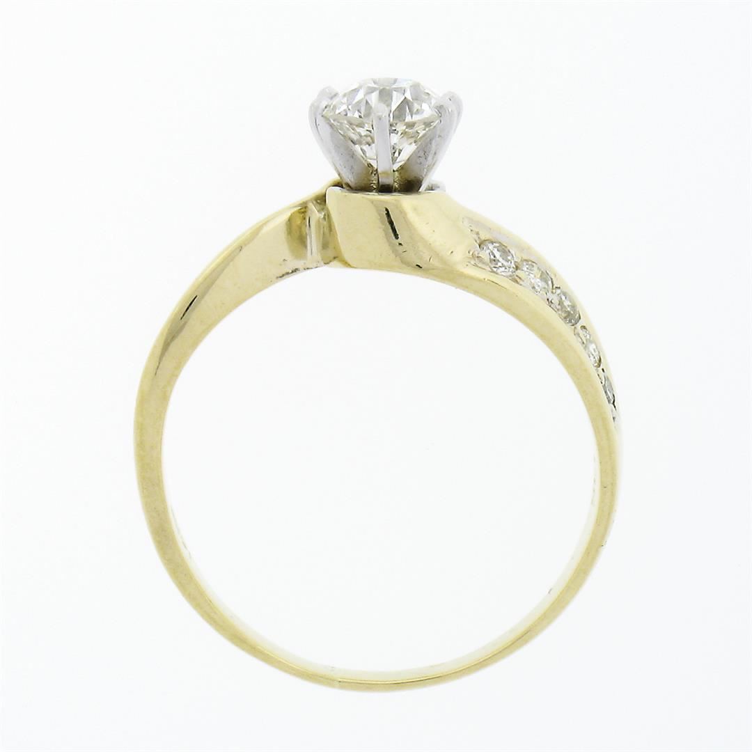 A vintage solid 14k yellow & white gold engagement ring, featuring 1 old european cut natural diamond (G - VS2 ; 0.54ct ), & 10 round briliiant cut natural diamonds (G/H - SI1/SI2 ; 0.20ctw). The ring is size 5.5, weighs a total of 2.59 grams, and measures 6.1mm wide.