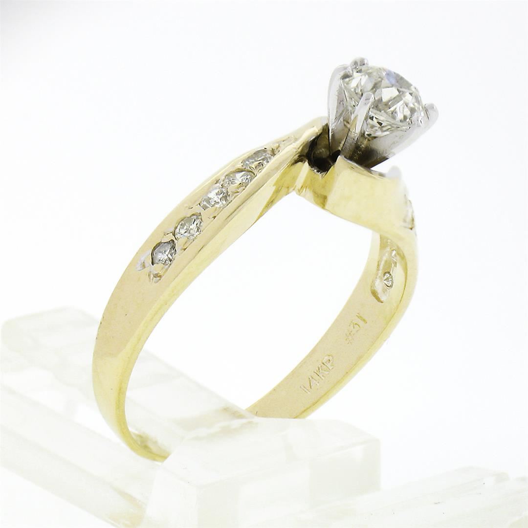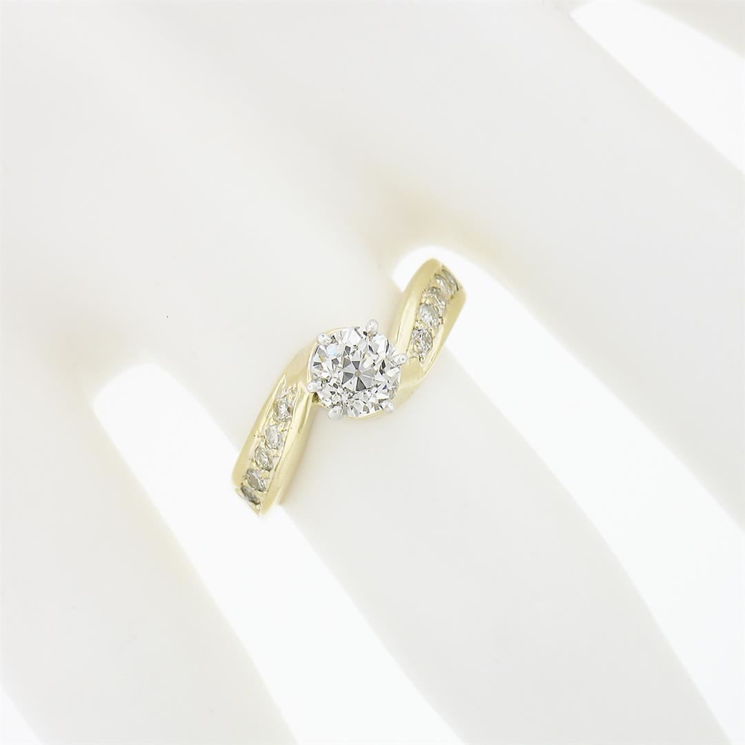 A vintage solid 14k yellow & white gold engagement ring, featuring 1 old european cut natural diamond (G - VS2 ; 0.54ct ), & 10 round briliiant cut natural diamonds (G/H - SI1/SI2 ; 0.20ctw). The ring is size 5.5, weighs a total of 2.59 grams, and measures 6.1mm wide.