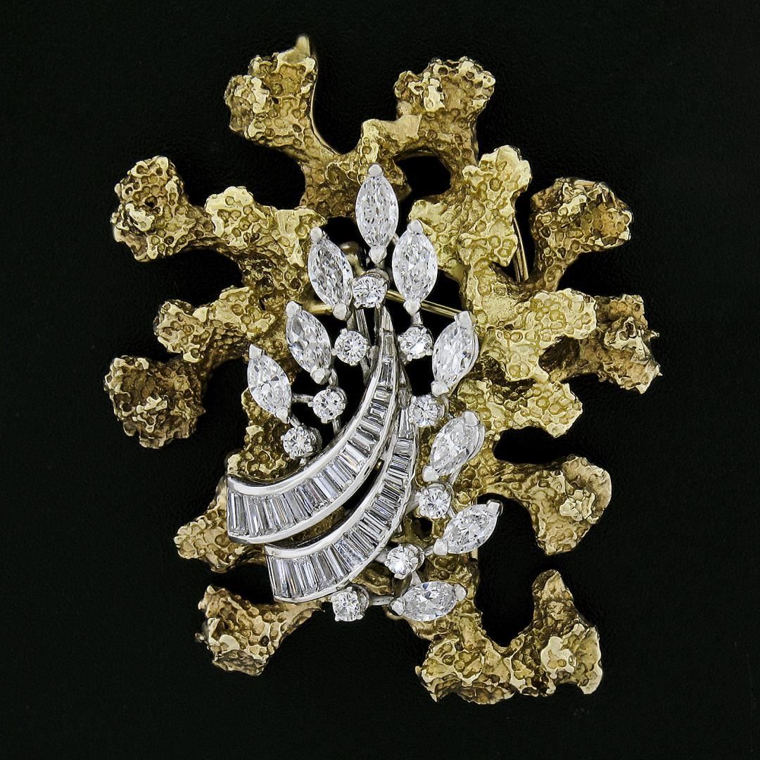 A vintage solid 14k yellow & white gold brooch, featuring 9 marquise cut, 9 round cut, 30 bageutte cut natural diamonds (G-I - VS1-SI1 ; 3.50ctw), and Measures 42.5x54.9mm and weighs a total of 24.14 grams.