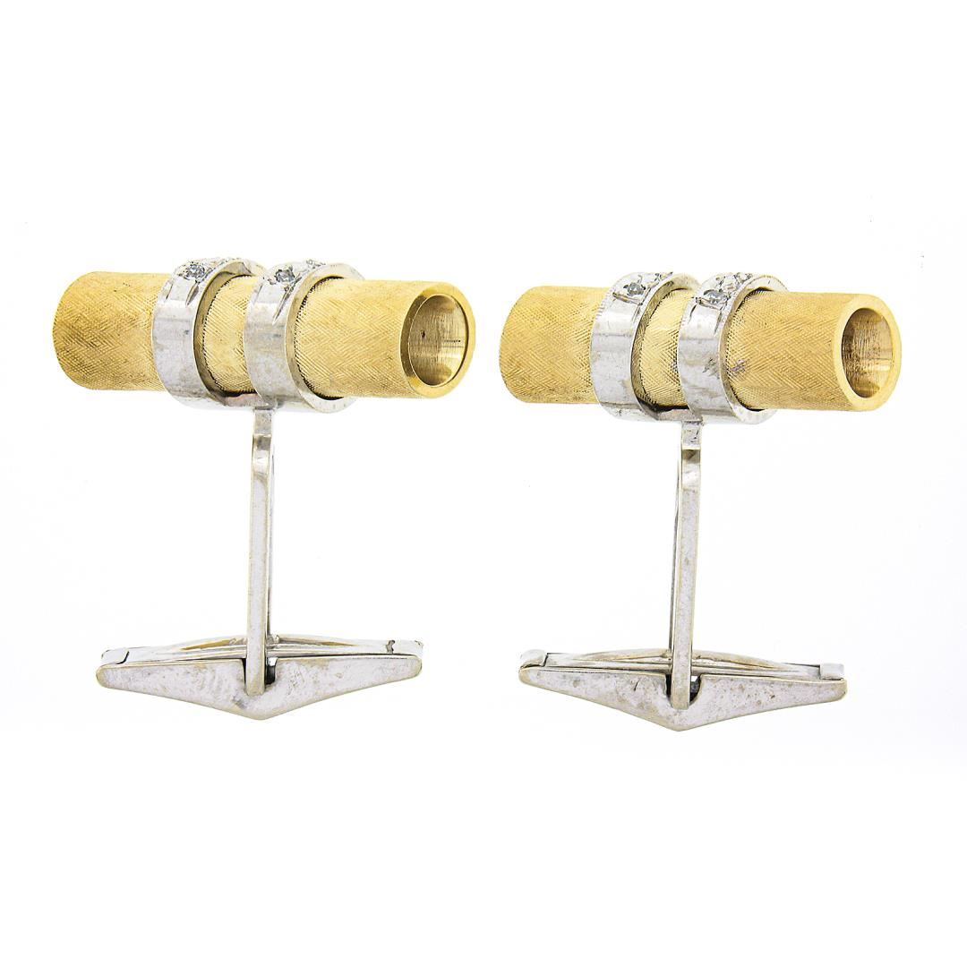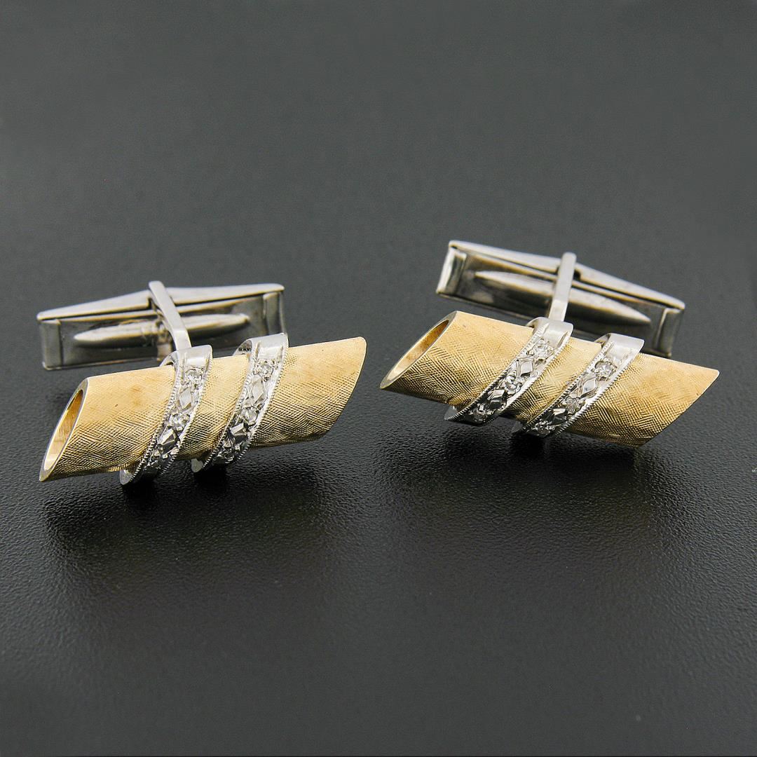 A vintage solid 14k yellow & white gold cufflinks, with 12 old single cut natural diamonds (G/H - SI1/SI2 ; 0.12ctw). These cuff links have a swivel design with a clearance of 14.2mm, weigh a total of 15.0 grams, and the front panels measure 16.3mm.