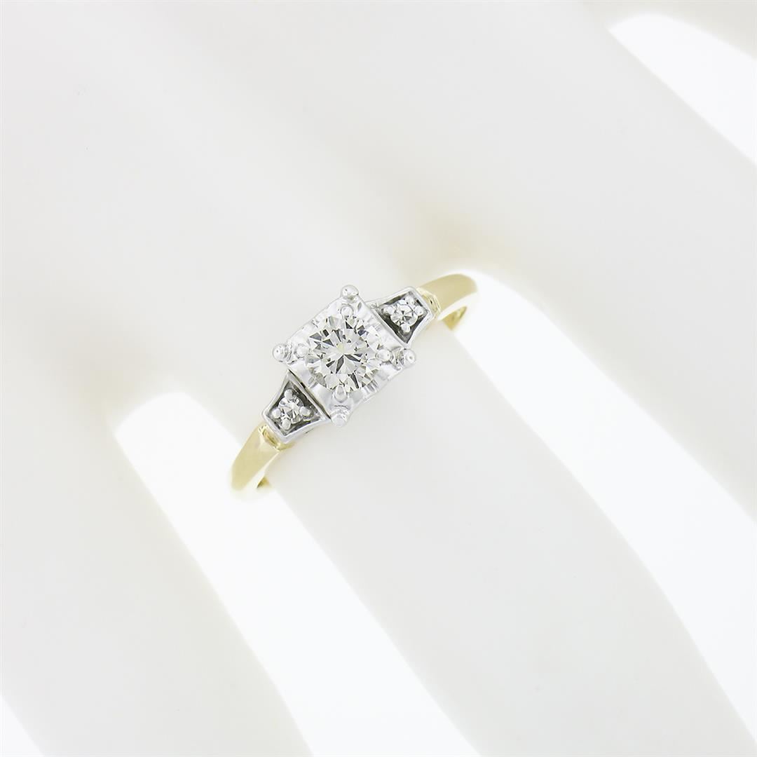A vintage solid 14k yellow & white gold engagement ring, featuring 1 round brilliant cut natural diamond (G - VVS2 ; 0.30ct ), accented with 2 single cut natural diamonds (G - VVS2 ; 0.06ctw). The ring is size 5.5, weighs a total of 2.50 grams, and measures 5.85mm wide.