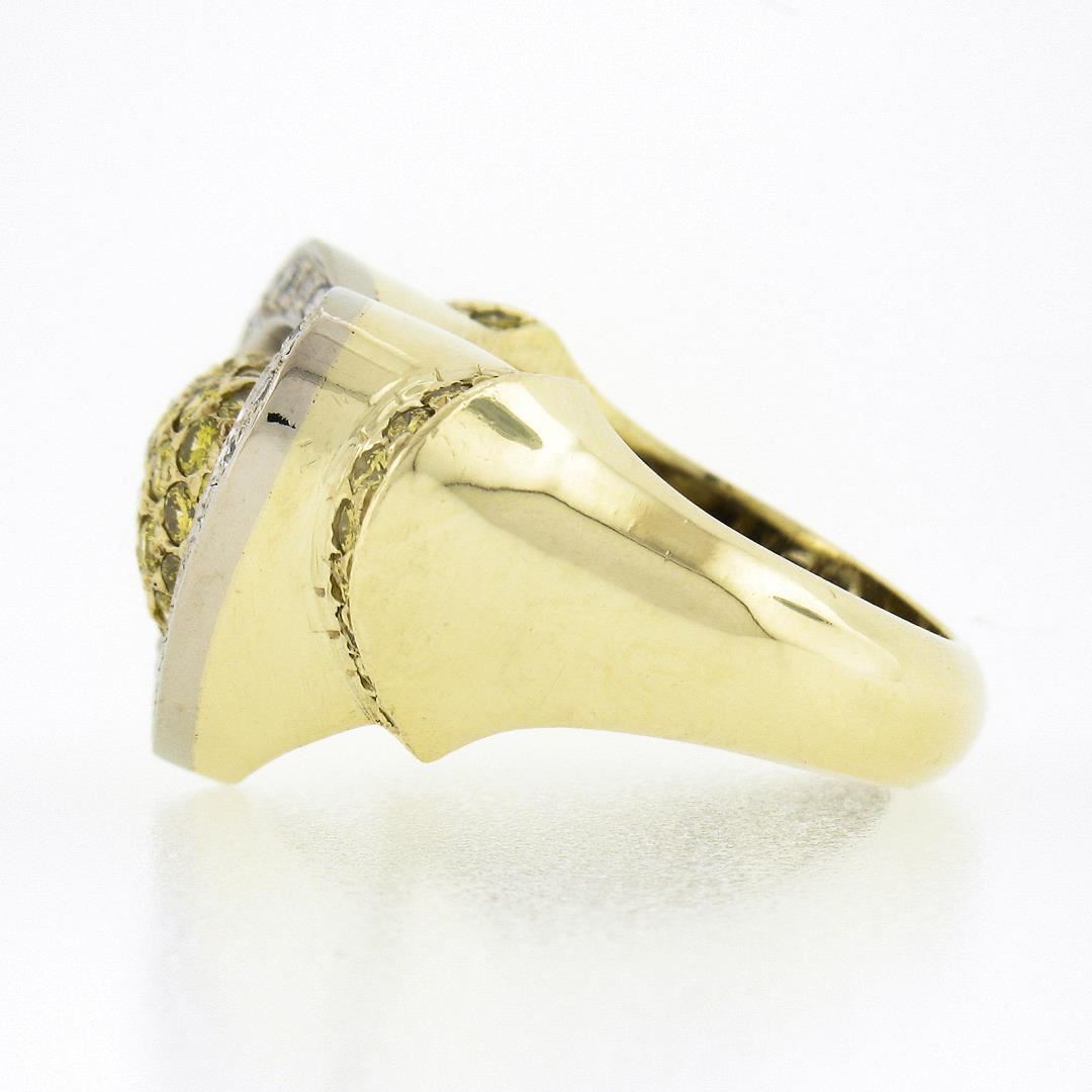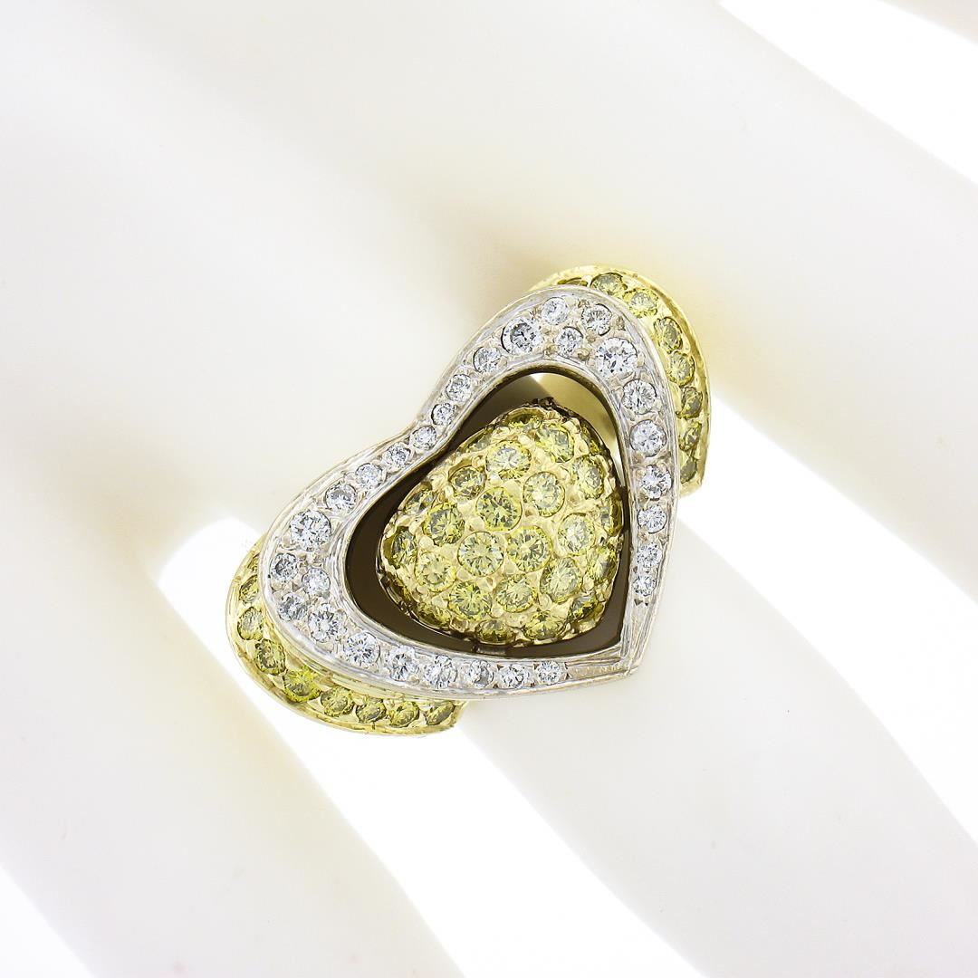 A vintage yellow & white gold heart ring, with 47 round brilliant cut fancy yellow natural diamonds (VS1/VS2 ; 1.15ctw), and 29 round brilliant cut natural diamonds (G/H - VS1/VS2 ; 0.45ctw). The ring is size 6.5, weighs a total of 13.28 grams, and measures 15.70mm wide.